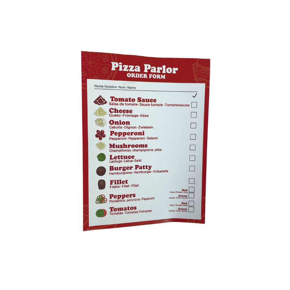 Pizzę możesz podzielić na 4 części, każdy z domowników może skosztować kawałek. Każdy dodatek ma specjalny otwór, żeby móc położyć na spodzie od pizzy według własnej kolejności. Każda pizza będzie oryginalna i wyjątkowa. Po niej czas na deser i napoje, wszystko zostało dołączone do zestawu. Dla gości w domowej pizzerii mamy kartę zamówień, w której mogą wybrać dowolne dodatki. Dla najedzonych zostało dołączone pudełko na wynos.