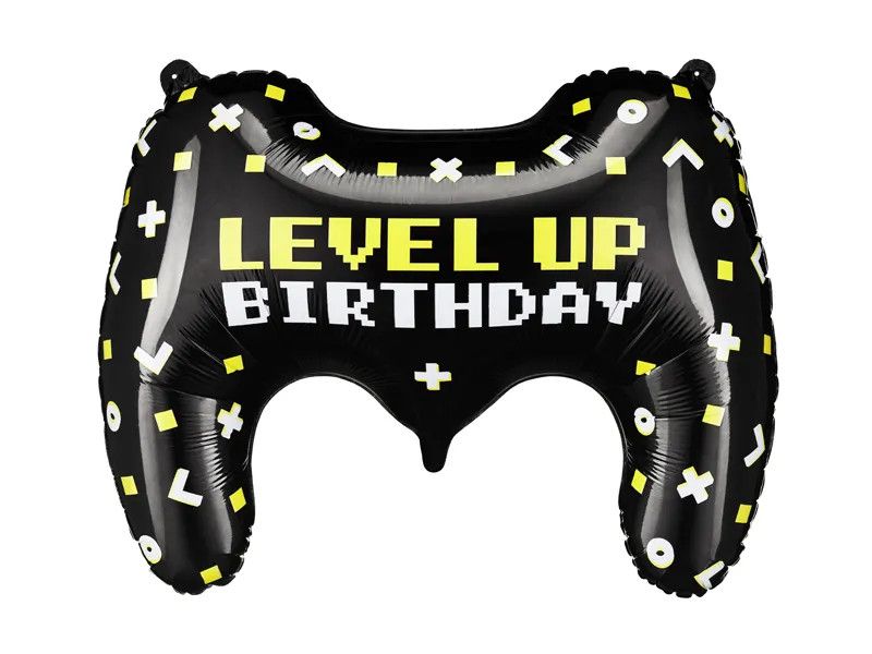 Balon foliowy Gamepad w kolorze czarnym z kolorowym nadrukiem i napisem ''Level up Birthday'', wymiary przed napompowaniem ok. 72 x 52 cm (28 x 20.5''), wymiary po napompowaniu ok. 60 x 45 cm (25.5 x 18''). Do napompowania powietrzem i helem. Zestaw zawiera słomkę.