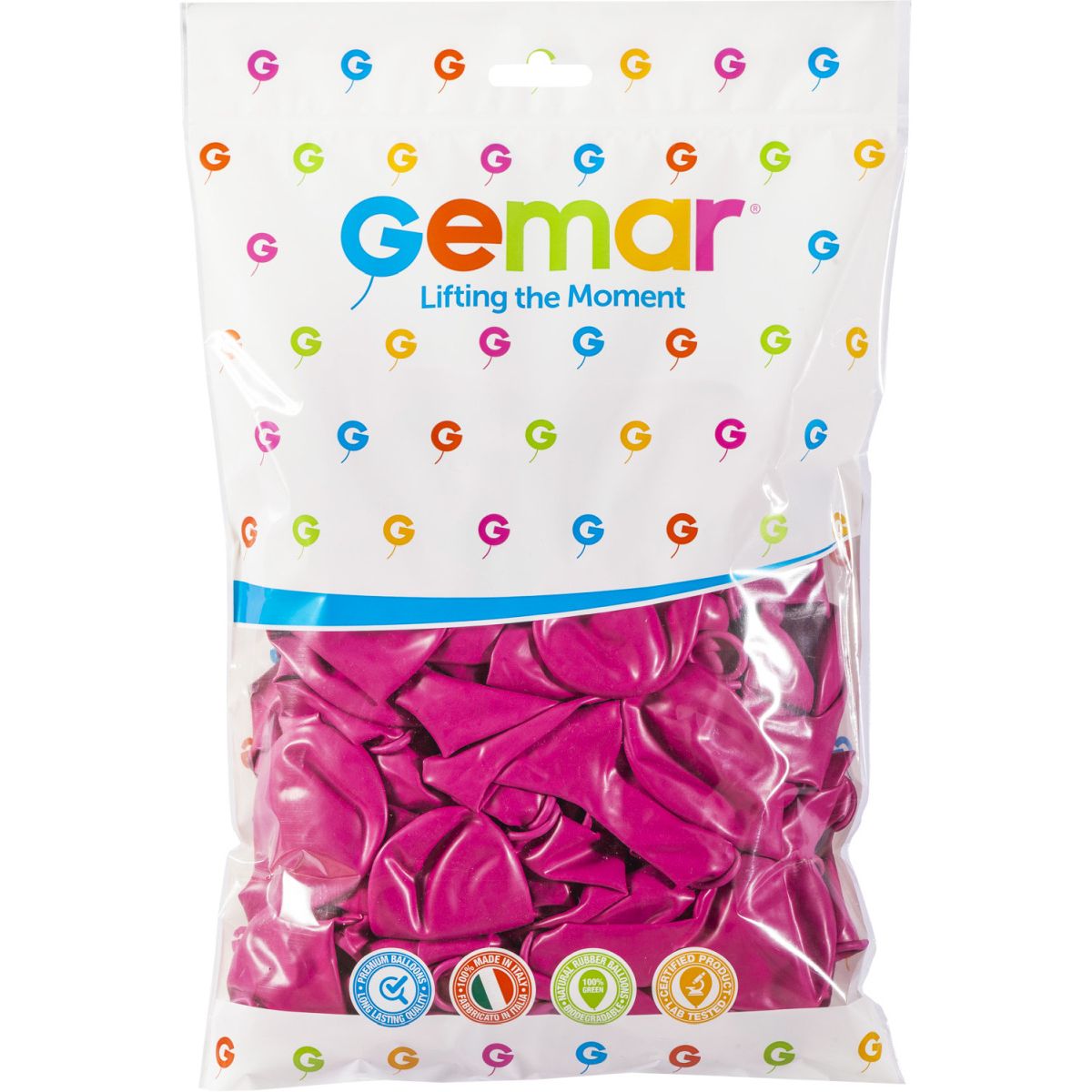 Balony gumowe o rozmiarze 12 cali (około 30 cm) w kolorze różowym ciemnym pastelowym, produkcji włoskiej firmy Gemar. Każdy balon posiada odpowiednio długą końcówkę, która umożliwia bezproblemowe zawiązywanie.