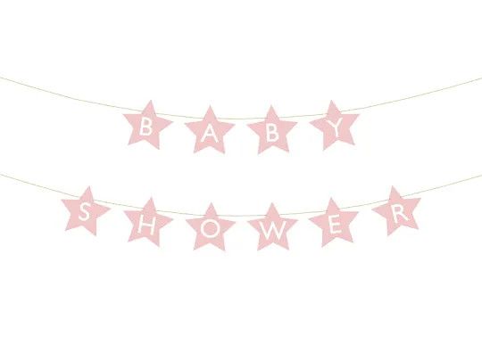 Baner w kształcie gwiazdek z napisem Baby Shower wykonany z papieru w kolorze jasnoróżowym, wymiary sznurka ok. 3m.