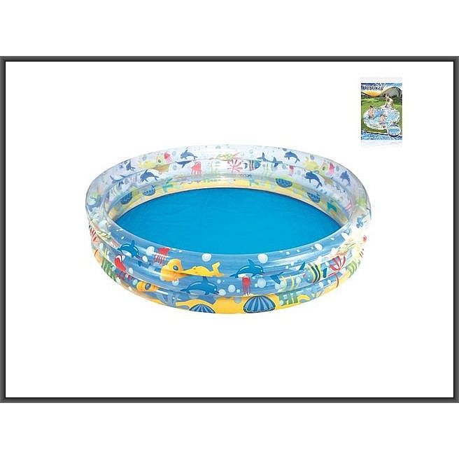 Nadmuchiwany okrągły basen ogrodowy firmy BESTWAY - zbudowany jest z trzech połączonych ze sobą komór powietrznych, z których każda posiada zawór bezpieczeństwa. Grube i miękkie ścianki basenu wykonane są z wytrzymałego przeźroczystego winylu z graficznym motywem podwodnego świata. Produkt przeznaczony dla dzieci powyżej trzeciego roku życia.