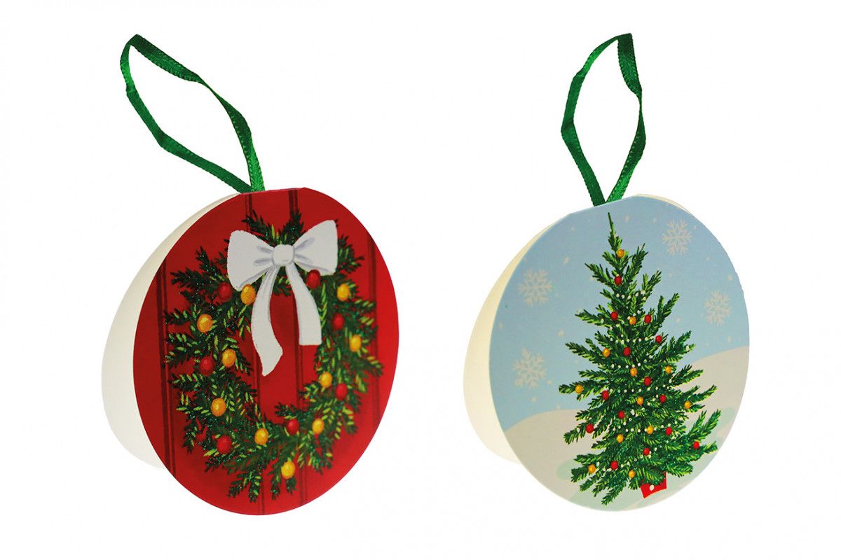 Dostępne: 576 Sztuk Lub zamów telefoniczne: 690 216 578Karnety prezentowe, wzór: Boże Narodzenie, okrągłe, średnica 70 mm, brokatowane, 2 wzory: świąteczny wieniec z białą kokardą na czerwonych drzwiach, choinka z bombkami i łańcuchem w czerwonej donicy na śniegu. 8 sztuk + wstążka 1,5 m.