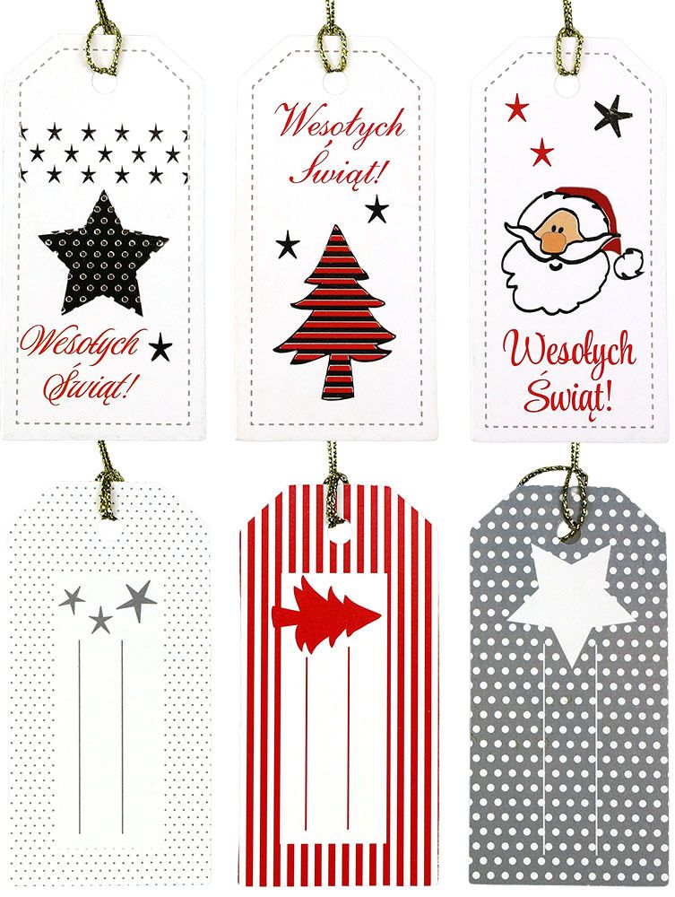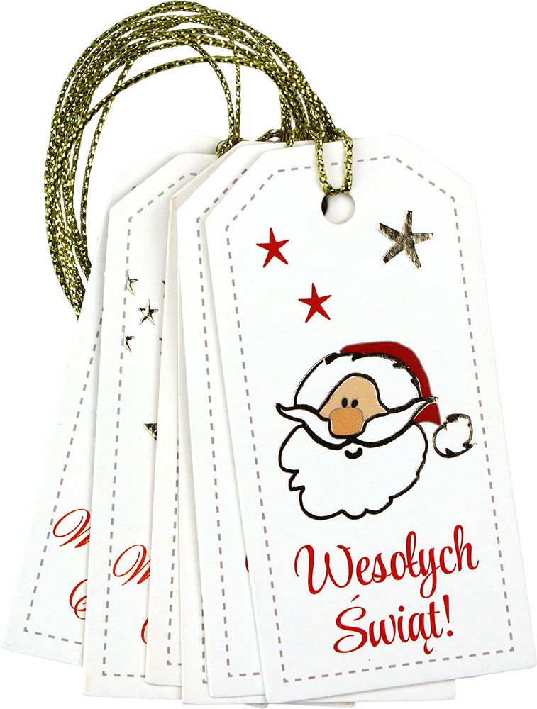 Dostępne: 1191 Sztuk Lub zamów telefoniczne: 690 216 578Zawieszki prezentowe z napisem „Wesołych Świąt”, wymiary: 40x80 mm, 3 wzory: gwiazdka, głowa Mikołaja, choinka, dwustronny zadruk z miejscem do wypełnienia. 6 sztuk.