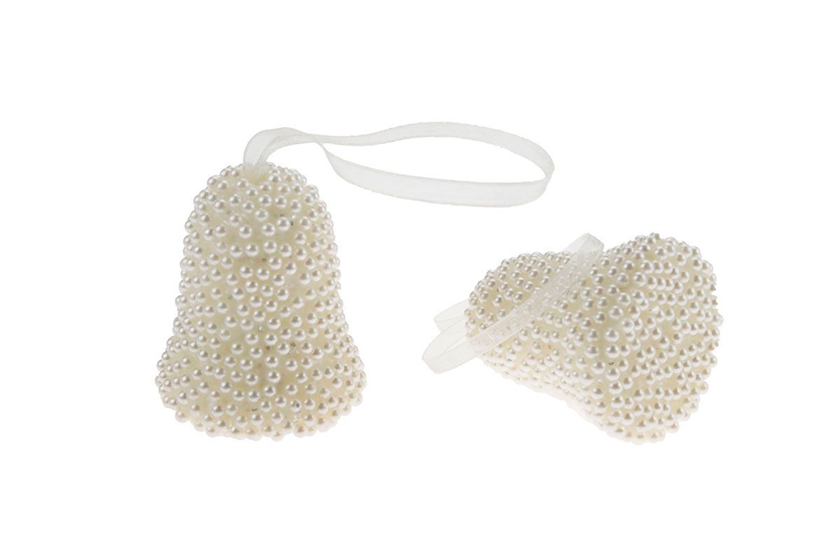 Dostępne: 337 Sztuk Lub zamów telefoniczne: 690 216 578Zawieszki dzwonki, 40 x 50 mm, na wstążce satynowej, oklejone perełkami. 2 sztuki.