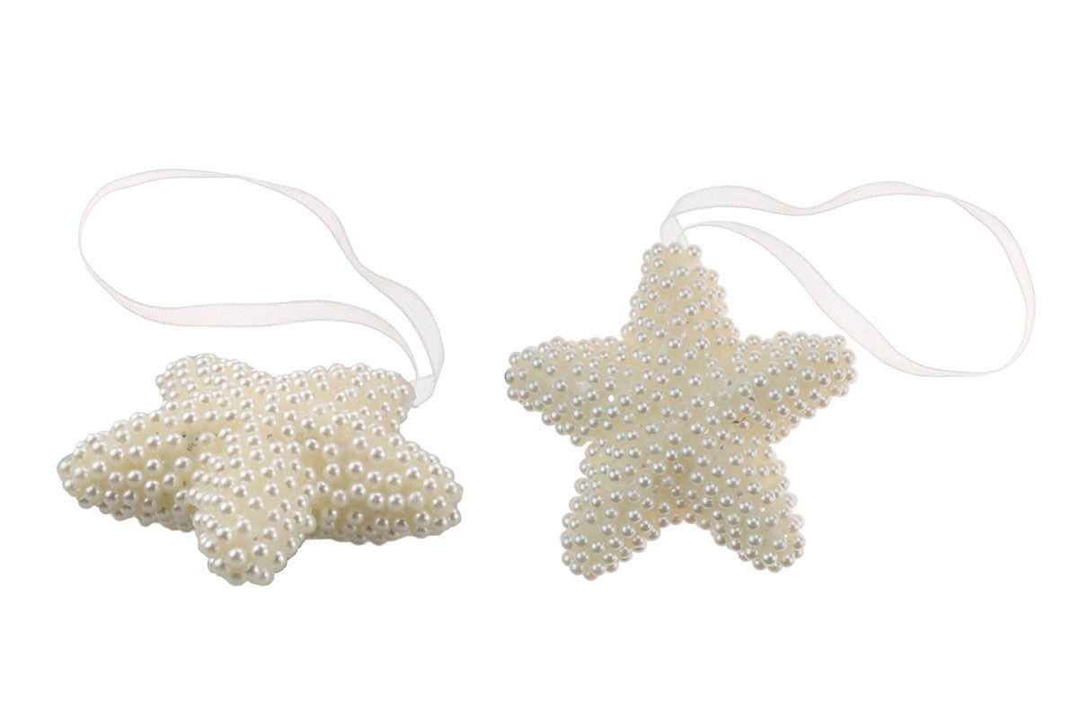 Dostępne: 231 Sztuk Lub zamów telefoniczne: 690 216 578Zawieszki gwiazdki, 60 x 56 mm, na wstążce satynowej, oklejone perełkami. 2 sztuki.