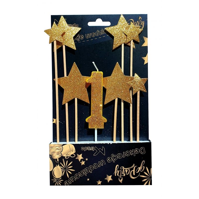 Dostępne: 10 Sztuk Lub zamów telefoniczne: 690 216 578Dekoracja urodzinowa DF-072, Topper złote gwiazdki i świeczka "1", 8 szt.