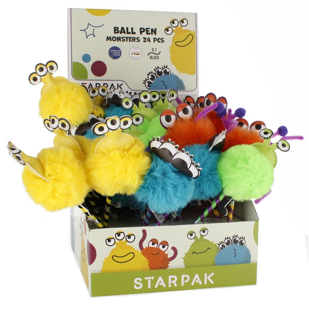 Dostępne: 4 Sztuk Lub zamów telefoniczne: 690 216 578Zalety produktu: Teraz nawet długopis może Cię wprowadzić w świat zabawek. STARPAK wyszedł naprzeciw Waszym oczekiwaniom i wprowadził do swojej oferty zamykane długopisy zakończone śmieszną pluszową figurką Monster. Idealny do użytkowania w szkole w domu. Zapoznaj się również z innymi produktami Starpak dedykowanymi dla szkoły i biura Długopis pakowny w display po 24 sztuki, wkład czarny, grubość 0,7mm. Wykonany z trwałego materiału, Figurka Monster występuje w 4 kolorach: żółty, pomarańczowy, niebieski, zielony. Produkt nieodpowiedni dla dzieci poniżej 3 lat. Wymiary opakowania wys. x szer. x gł. cm : 26x23x30. Waga produktu w opakowaniu kg : 0,78. Waga produktu bez opakowania kg : 0,02.