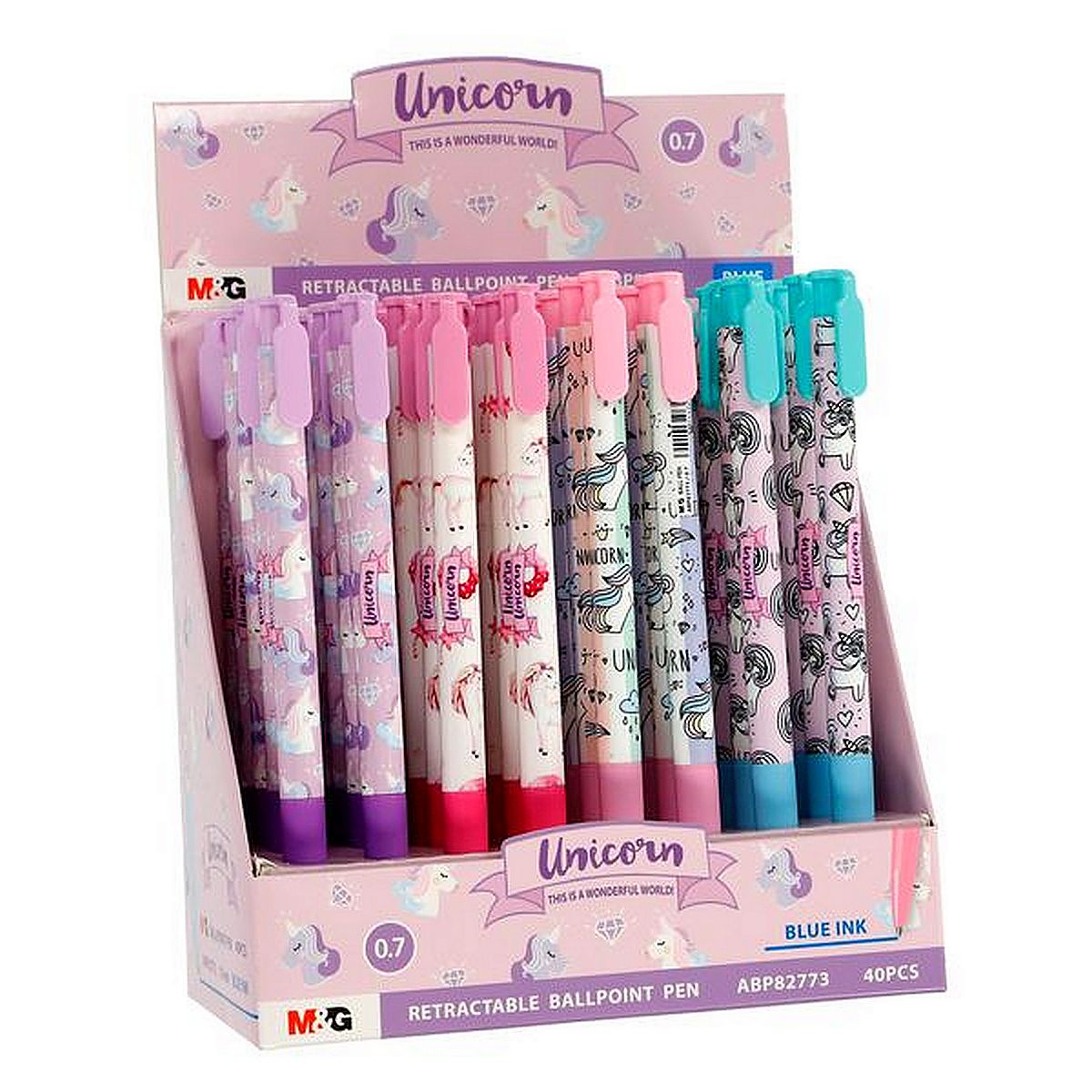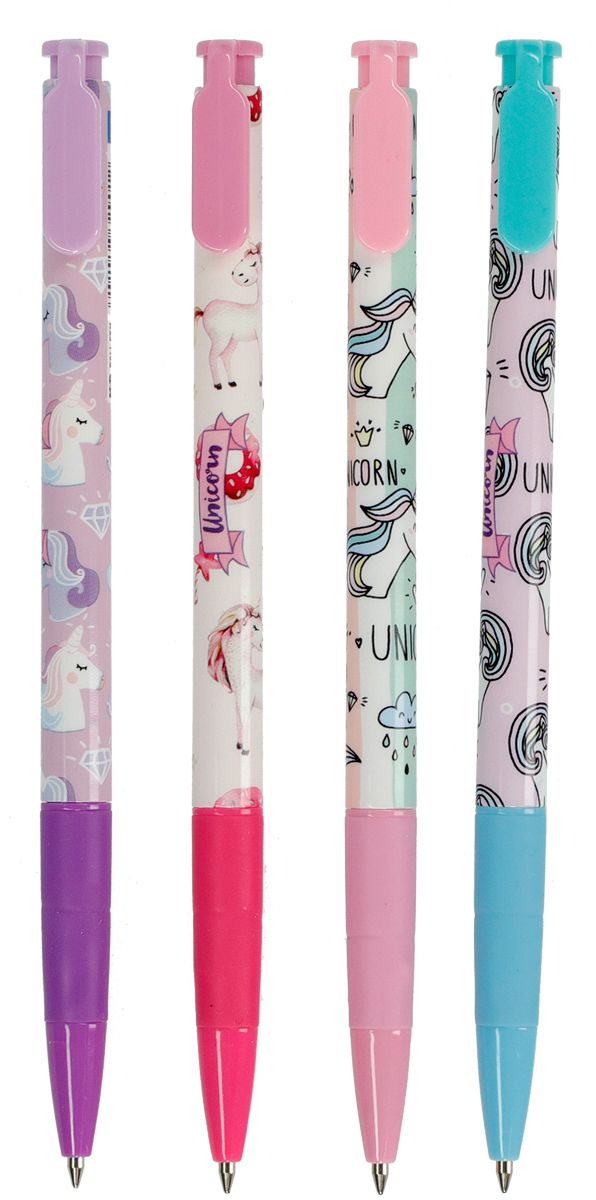 Długopis automatyczny w modnej stylizacji, ze specjalną dedykacją dla dzieci i młodzieży. Plastikowa obudowa zdobiona kolorowymi motywami w postaci jednorożców. Dzięki swojemu oryginalnemu wyglądowi, długopis nada uroku każdemu piórnikowi. Miękka, pokryta gumą strefa uchwytu zapewniająca komfort podczas pisania. Praktyczny, plastikowy klips umożliwiający wpięcie w dogodnym miejscu. Wkład wymienny w kolorze niebieskim.