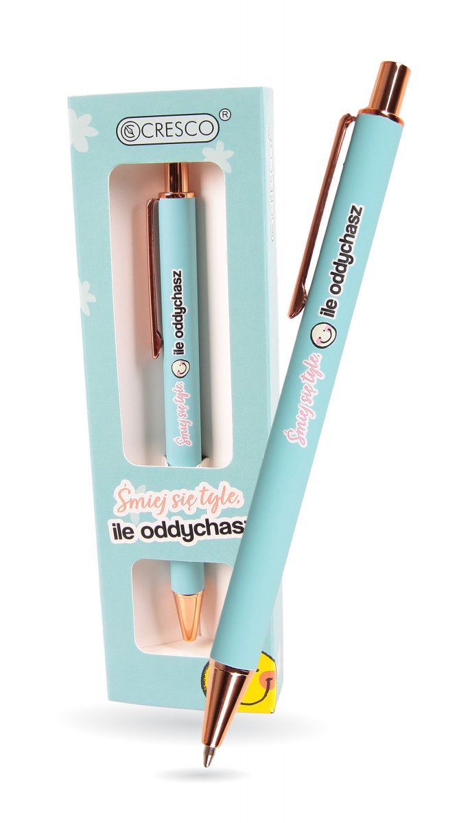 Dostępne: 13 Sztuk Lub zamów telefoniczne: 690 216 578Długopis automatyczny z wymiennym wkładem 1mm. Kobieca kolorystyka, softowy, pastelowy korpus ze wykończeniami w odcieniach różowego złota. Nadruk na długopisie i pudełeczku to „Śmiej się tyle, ile oddychasz”. Dodatkowo wzbogacony nadruk o wyjątkową grafikę. Długopis zapakowany w prezentowe etui GB, w sam raz na upominek dla NIEJ.Nieodpowiednie dla dzieci poniżej 3 lat. Sugerowany wiek +5. Ostre zakończenia. Ryzyko zranienia oka. Zawiera małe elementy. Ryzyko połknięcia, zadławienia, uduszenia. Do użytku pod nadzorem osoby dorosłej.