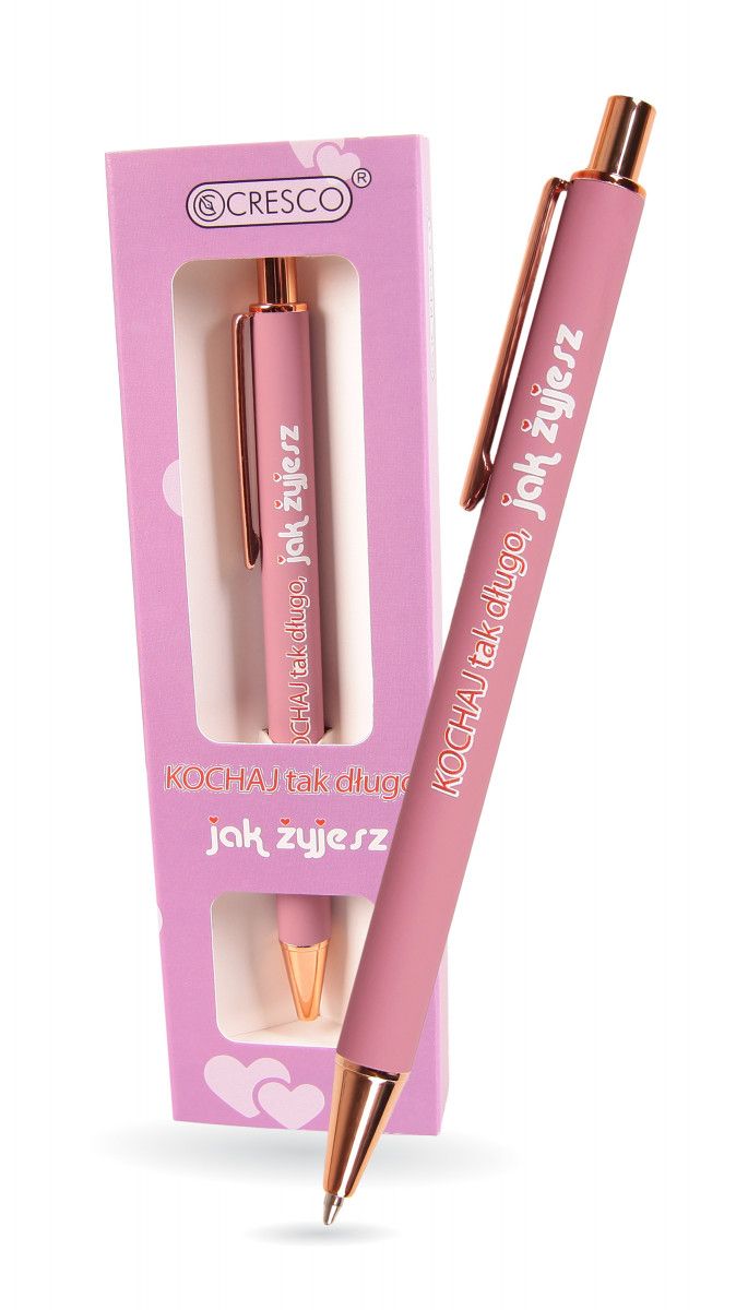 Dostępne: 10 Sztuk Lub zamów telefoniczne: 690 216 578Długopis automatyczny z wymiennym wkładem 1mm. Kobieca kolorystyka, softowy, pastelowy korpus ze wykończeniami w odcieniach różowego złota. Nadruk na długopisie i pudełeczku to „Kochaj tak długo, jak żyjesz”. Dodatkowo wzbogacony nadruk o wyjątkową grafikę. Długopis zapakowany w prezentowe etui GB, w sam raz na upominek dla NIEJ.