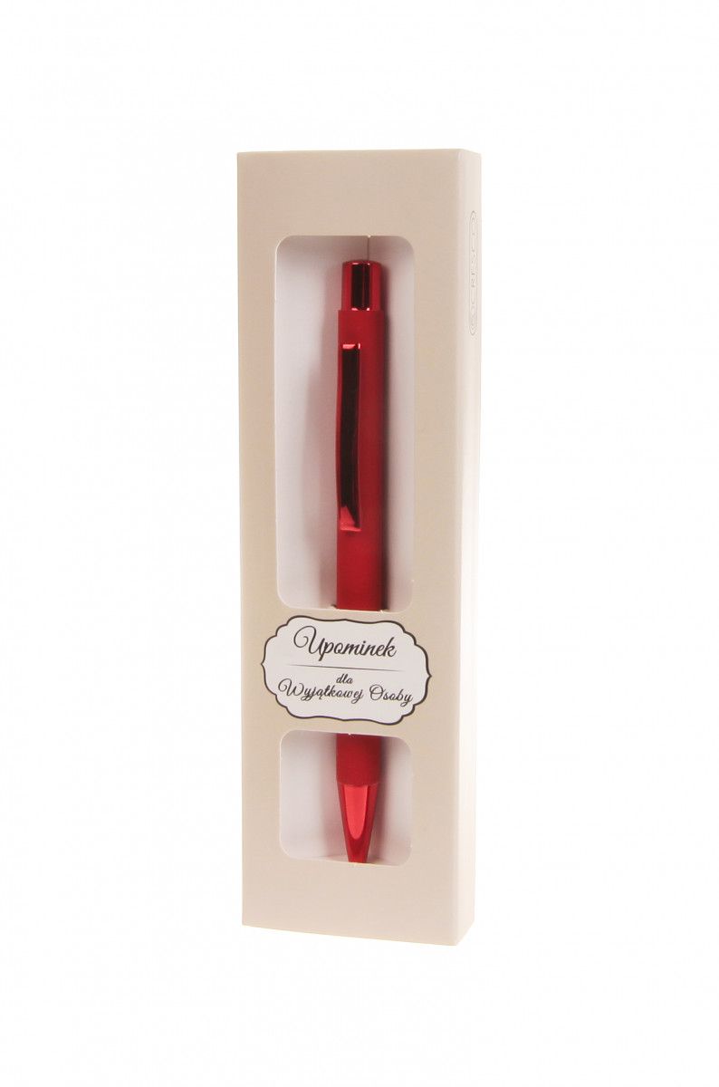 Dostępne: 4 Sztuk Lub zamów telefoniczne: 690 216 578Długopis automatyczny CITY o wyjątkowym softowym korpusie w matowym czerwonym kolorze z błyszczącymi wykończeniami. Długopis wyposażony został w wymienny wielkopojemnościowy wkład typu zenith o grubości 1mm linii pisania. Zapakowany w upominkowe etui GB.