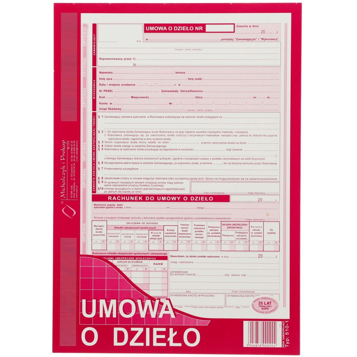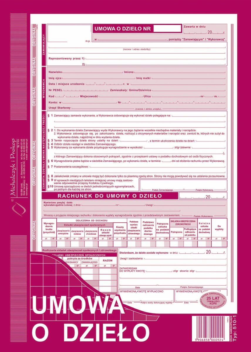 Druk offsetowy Michalczyk i Prokop Umowa o dzieło z rachunkiem A4 A4 40k. (510-1)