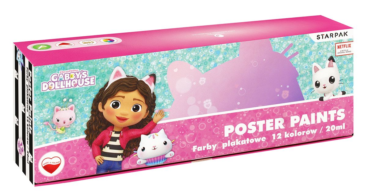 Dostępne: 14 Sztuk Lub zamów telefoniczne: 690 216 578Zalety produktu: Farby plakatowe STARPAK w 12 intensywnych kolorach rozwijające kreatywność małych twórców. Dzięki optymalnej konsystencji farby dokładnie pokrywają malowaną powierzchnię i mają długi okres trwałości. Piękna szata graficzna inspiruje małych malarzy. Każdy kolor farby jest zamknięty w oddzielnym 20 ml zakręcanym pojemniczku, a całość w kartonowym pudełku zdobionym inspirującą grafiką Gabby& 39;s Dollhouse co ułatwia przechowywanie farb. Farby plakatowe są produkowane w Polsce. Wymiary/waga: Wymiary produktu szer. x wys. x gł. cm : 3x4x3, Wymiary opakowania szer. x wys. x gł. cm : 23x4x8, Waga produktu kg : 0,04 kg, Waga opakowania kg : 0,50 kg. Nie odpowiednie dla dzieci poniżej 3 lat. Pakowane w otwierany kartonik. Pakowane Iner 6szt. Karton 24szt.