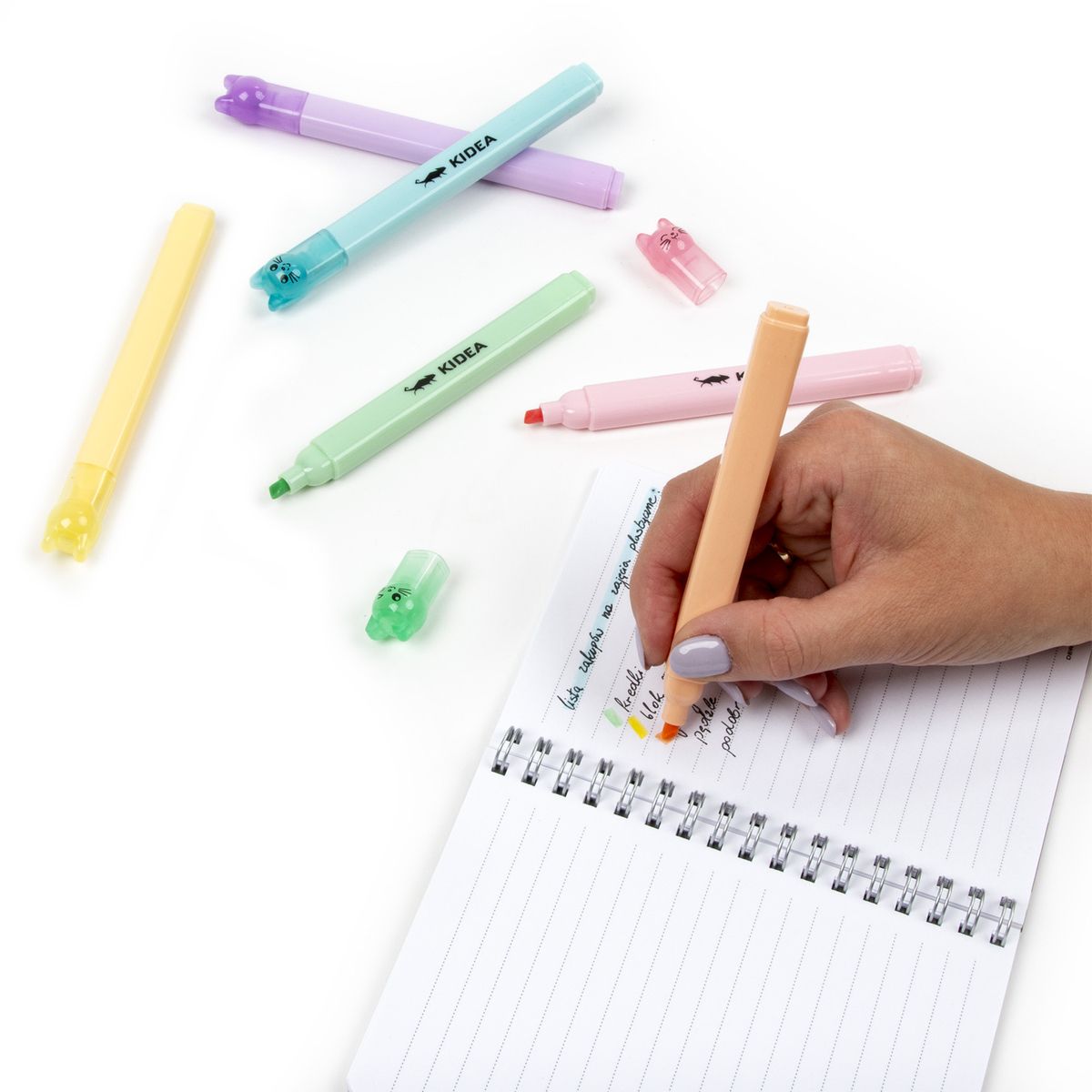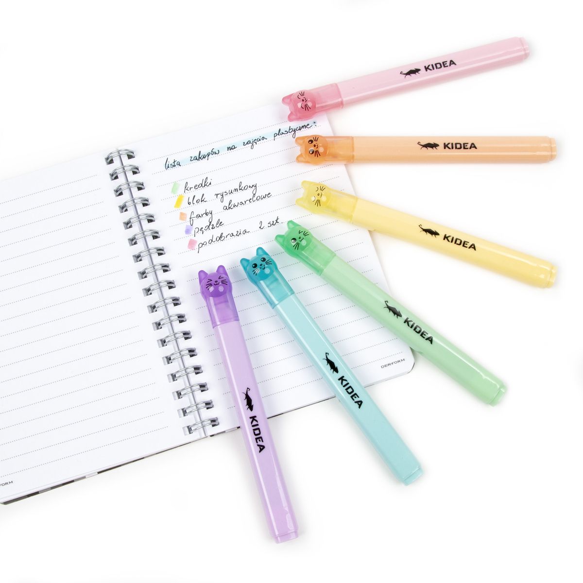 Dostępne: 16 Sztuk Lub zamów telefoniczne: 690 216 578Flamastry pastelowe Kidea z zatyczkami w kształcie kotków w 6 kolorach: zielonym, żółtym, brzoskwiniowym, różowym, fioletowym i niebieskim. Zaokrąglona końcówka zapewnia precyzję, a ergonomiczny kształt flamastrów idealnie wpasowuje się w dziecięcą rękę. Kotki na zatyczkach dodają jedynego w swoim rodzaju, uroczego charakteru. Flamastry bardzo dobrze kryją, pozostawiając na kartce wyraziste, pastelowe kolory. Sprawdzą się zarówno przy tworzeniu prac plastycznych, podkreślaniu, czy zakreślaniu.