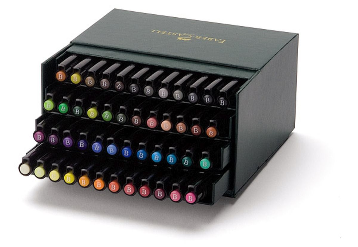 Pitt artist pen Faber Castell. Zestaw 48 pisaków w eleganckim etui. Idealnie zaspokaja potrzeby profesjonalnych twórców komiksu, mangi, projektantów, ilustratorów, kraślarzy, oferując szeroką gamę kolorystyczną. Pisaki z końcówką pędzelkową (brush pen).