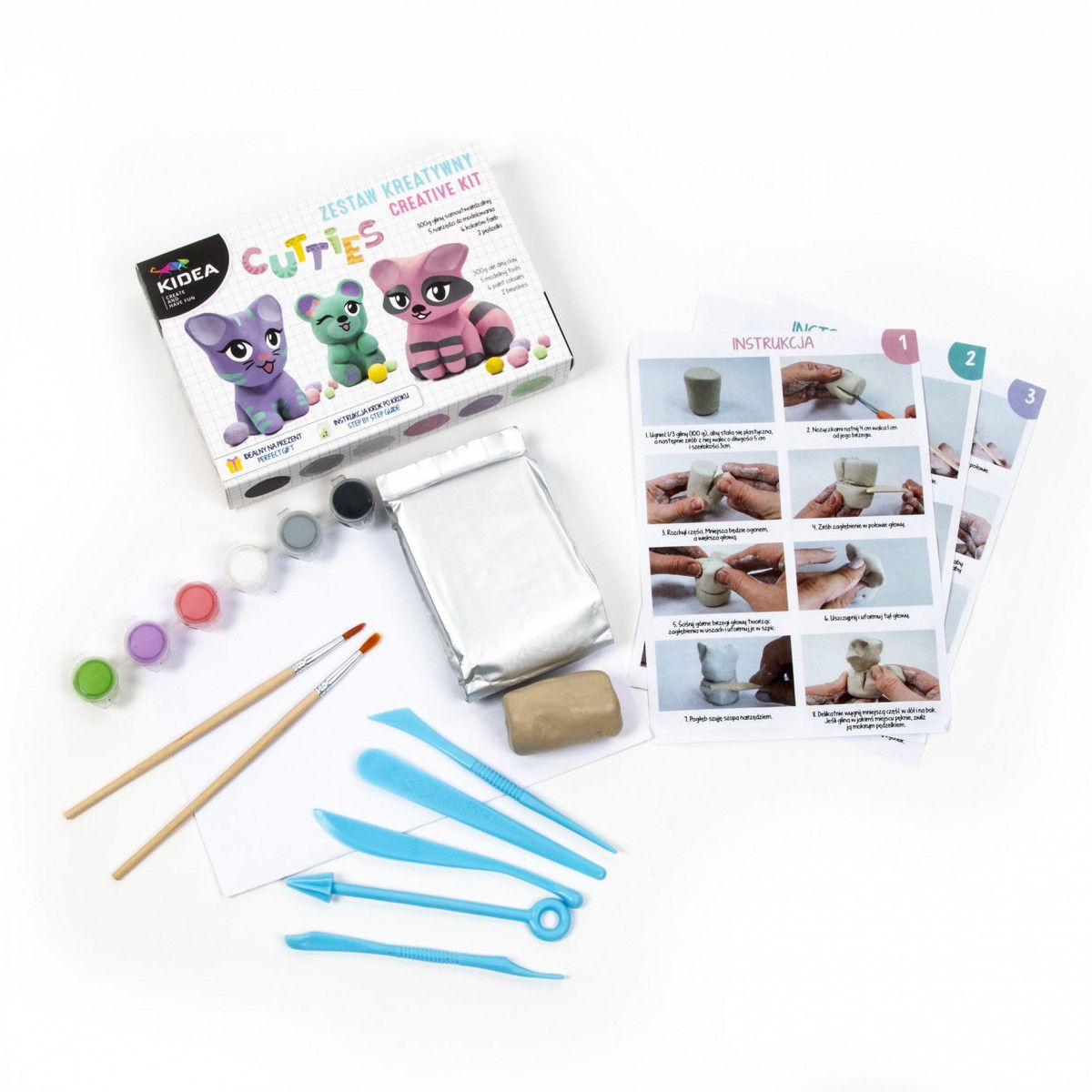 Dostępne: 6 Sztuk Lub zamów telefoniczne: 690 216 578Glina samoutwardzalna misie - zestaw kreatywny od Kidea! W opakowaniu znajduje się 300 g gliny samoutwardzalnej, 6 kolorów farbek, 5 narzędzi rzeźbiarskich, dwa pedzelki różnej wielkości oraz instrukcja "krok po kroku". Podążając za krokami instrukcji i przy pomocy narzędzi można ulepić trzy zwierzaki - kotka, szopa oraz misia! Niezwykle kryjące farbki o pastelowych barwach nadają figurkom uroczy charakter. Gotowe figurki można podarować bliskiej osobie lub udekorować nimi na przykład biurko. Zestaw glina samoutwardzalna misie to świetny pomysł na wspólną, kreatywną zabawę z dzieckiem lub na wyjątkowy prezent.