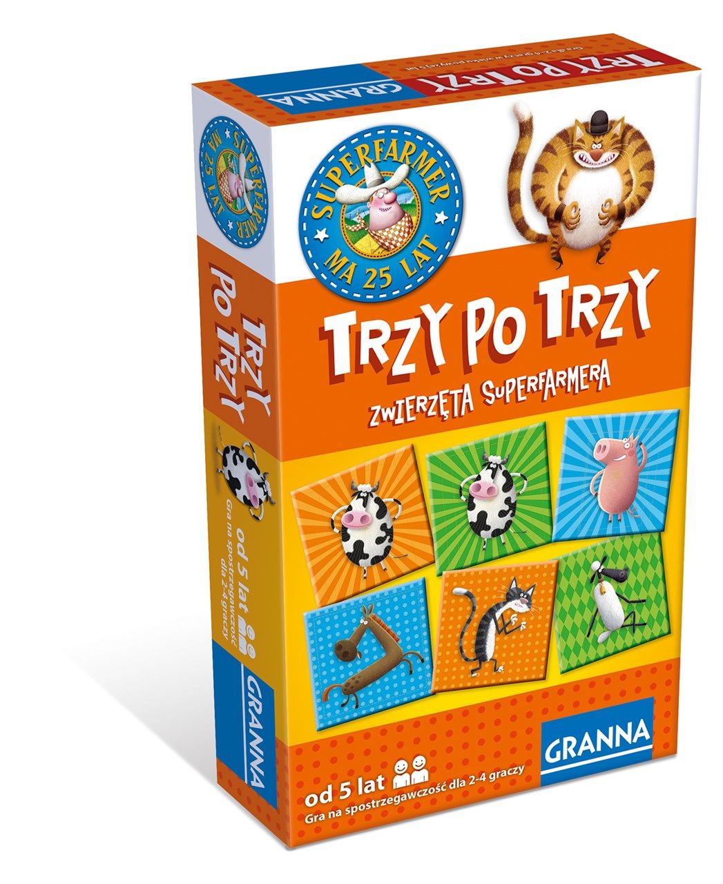 Znana i lubiana w Polsce gra „Trzy po trzy” teraz w nowej, Superfarmerowej szacie graficznej. Szybka i zabawna gra logiczna, która ćwiczy spostrzegawczość. Gra imprezowa dla całej rodziny!
