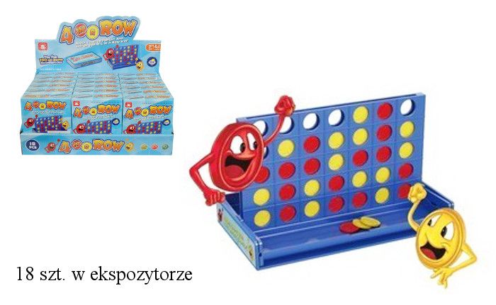 Dostępne: 5 Sztuk Lub zamów telefoniczne: 690 216 578Gra logiczna 4 w linii. W zestawie znajduje się 1 stojąca plansza do gry, żetony w 2 kolorach. Zadanie jest takie, że trzeba ułożyć w linii 4 żetony w tym samym kolorze. Wydaje się proste, ale wcale takie nie jest! Ta gra potrzebuje skupienia i strategii, aby wygrać.