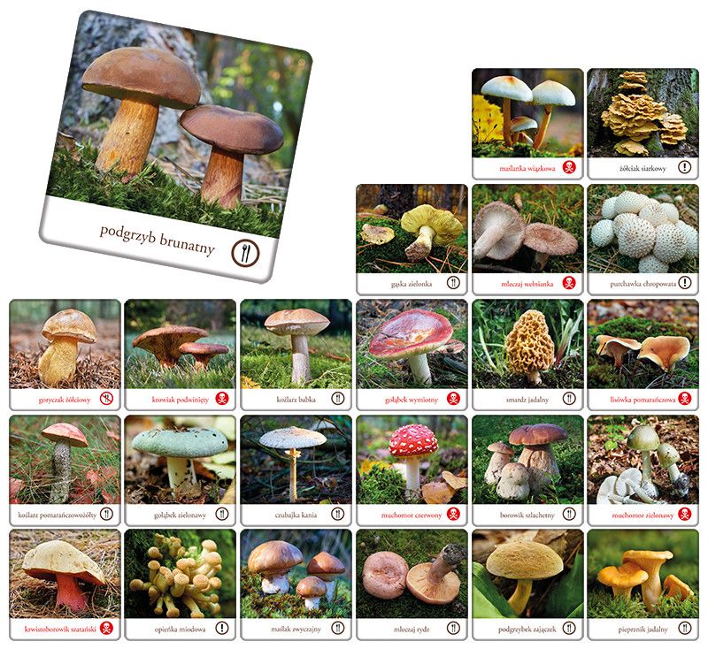 Dostępne: 2 Sztuk Lub zamów telefoniczne: 690 216 578Czy potrafisz odróżnić borowika szlachetnego od koźlarza babki czy maślaka zwyczajnego? Przenieś się do lasu, gdzie spotkasz różnorodne gatunki najczęściej występujących w Polsce grzybów jadalnych, niejadalnych oraz trujących. Zanurz się w tym fascynującym świecie i zostań królem grzybobrania! Zestaw zawiera: 48 sztuk kafelków (24 par) oraz instrukcję