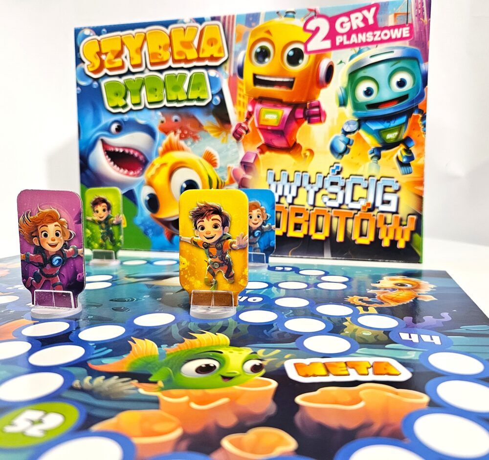 gra planszowa Szybka Rybka / Wyścig Robotów Dwie proste planszówki wprowadzające najmłodszych w świat gier. Klasyka w nowym wydaniu – atrakcyjna nowoczesna grafika, kolorowe tekturowe pionki. SZYBKA RYBKA Znaleźliście się w podwodnym świecie. Spotykacie tu przyjaciół – sympatyczne rybki i konika morskiego, którzy nauczą was, jak najszybciej przepłynąć ocean i dotrzeć do mety. Niestety na waszej drodze może stanąć rekin, przed którym będziecie musieli uciekać. WYŚCIG ROBOTÓW Jesteś jednym z niestrudzonych robotów eksplorujących odległą planetę S.T.A.R.T. Musisz jak najszybciej dostać się na kosmodrom, z którego odlatuje kosmiczny statek na Ziemię. Jeśli nie zdążysz, na zawsze pozostaniesz w kosmosie.