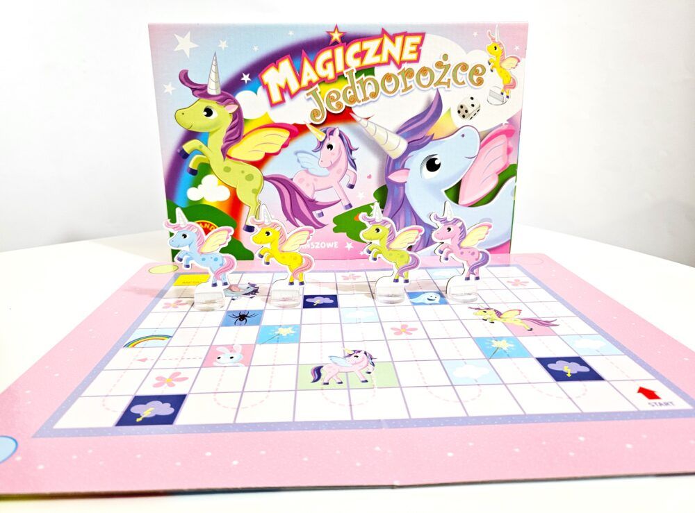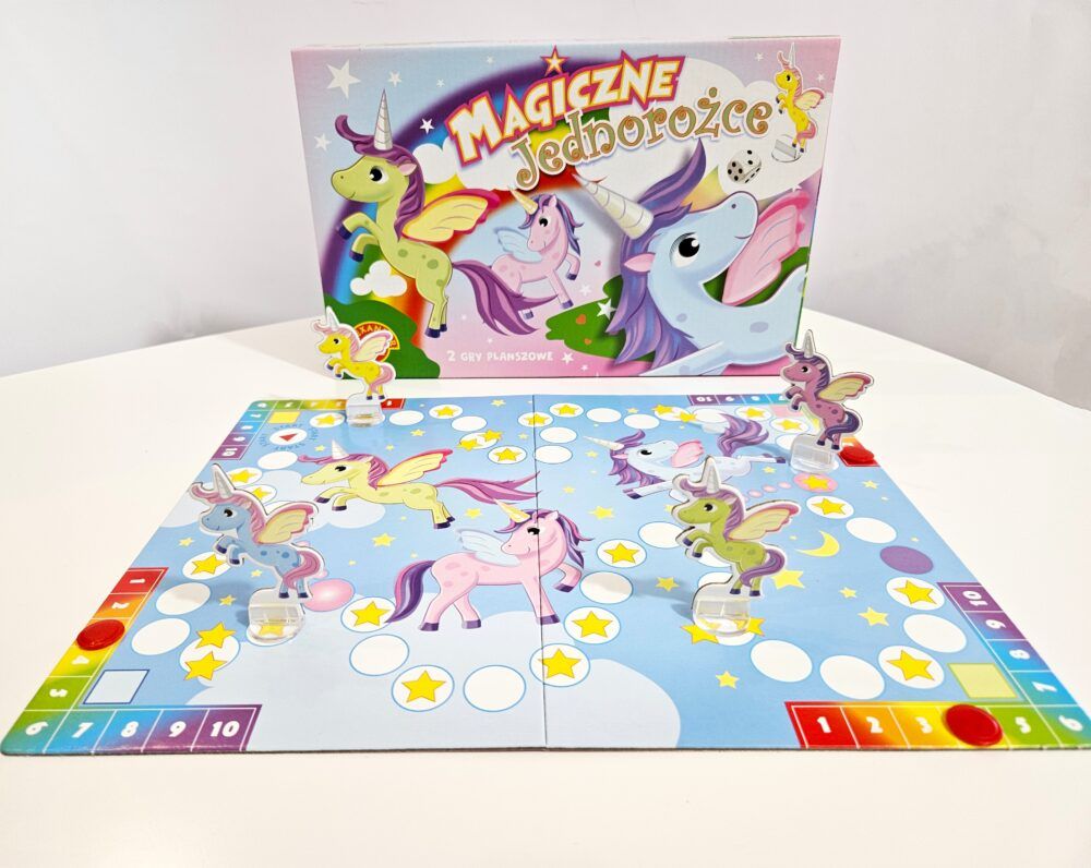 Dostępne: 7 Sztuk Lub zamów telefoniczne: 690 216 578gra planszowa Magiczne Jednorożce Magiczne Jednorożce to dwie gry planszowe pod wspólnym tytułem, skierowane do młodszych dzieci. Zasady gier są bardzo proste, ale cel jest różny. W pierwszej grze gracze – Jednorożce starają się zebrać jak najszybciej 10 gwiazdek, by rozświetlić nocne niebo. W tej grze dodatkową dawkę emocji daje możliwość wyboru, która łączy się jednak z ryzykiem. W drugiej grze Jednorożce wybierają się w podróż. Droga jest pełna emocjonujących niespodzianek, które mogą zdecydować o szybkości dotarcia do celu. W tej grze wygra Jednorożec, który pierwszy stanie na mecie. Obie gry to gwarancja dobrej zabawy i wielu emocji.