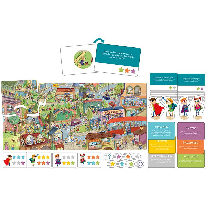 Wartości mają moc to wyjątkowa gra planszowa, w której gracze wcielają się w role Superbohaterów. Ich zadaniem będzie rozwiązywanie różnych problemów, które napotykają mieszkańcy miasteczka. Będziecie uczyć się o różnych wartościach takich jak szacunek, uczciwość, odwaga, które stanowią fundamenty życia społecznego. Ta gra to nie tylko świetna zabawa, ale również doskonała okazja do rozmowy o życiowych wartościach. Podczas gry dzieci będą miały możliwość doskonalić swoje umiejętności społeczne, a także kształtować swoją moralność i rozwijać empatię. Nie zwlekajcie Wcielcie się w role Superbohaterów i pokażcie, jak warto-ści mogą zmieniać świat na lepsze. Zawartość pudełka puzzlowa plansza 4 pionki 112 kart 64 żetony zasady gry
