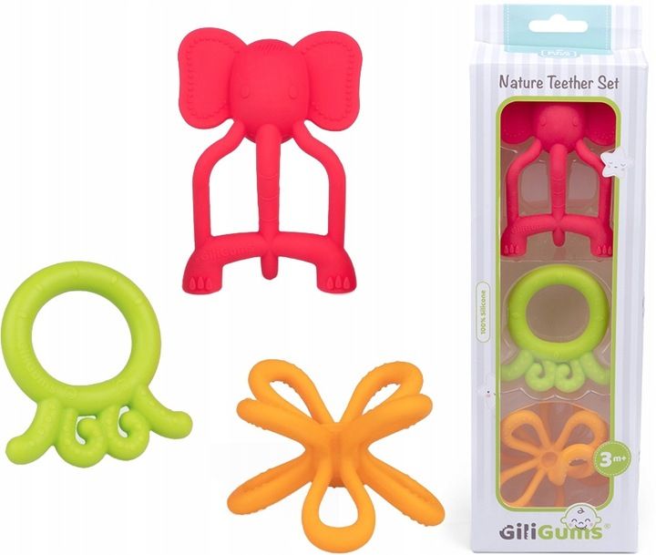 W opakowaniu znajdziemy aż 3 gryzaczki: czerwonego słonia, zieloną ośmiornicę oraz pomarańczowy kwiatek.