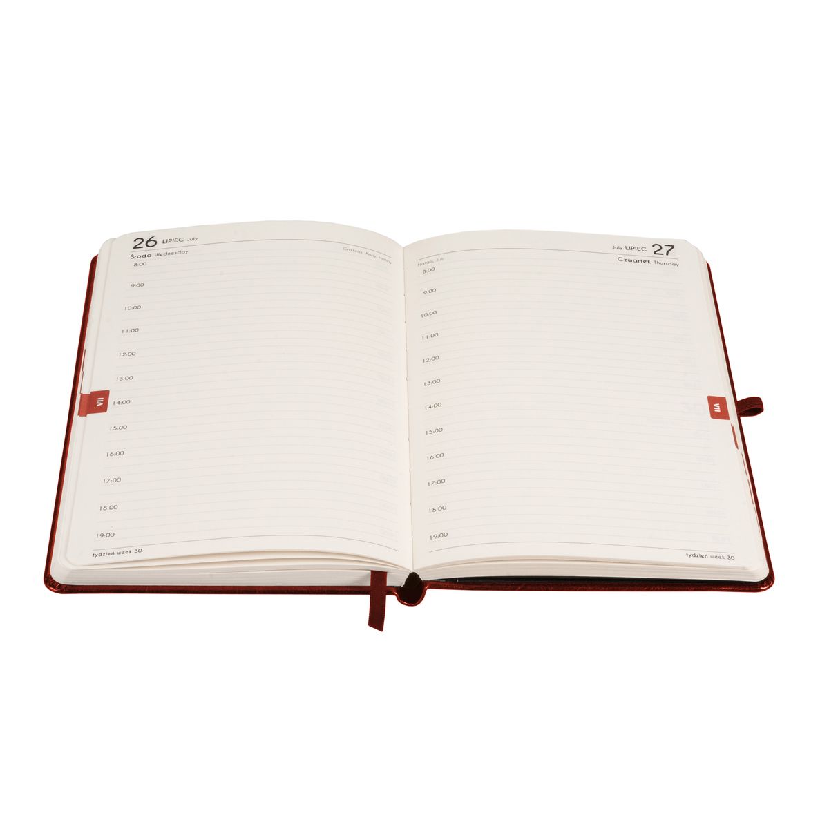 Dostępne: 2 Sztuk Lub zamów telefoniczne: 690 216 578format A5, oprawa: twarda, materiał: ekskluzywna skóra ekologiczna, papier: 80g, kolor papieru: ecru, pionowa gumka zamykająca, gumka na długopis, zaokrąglone rogi, wyklejka z ozdobnego czarnego papieru, koperta na luźne karteczki, wstążka w kolorze okładki, dodatkowe strony: skrócony kalendarz 2022-2024, plan roku 2026, ważne wydarzenia, notatnik oraz skorowidz adresowy, 352 strony, 210x145 mm