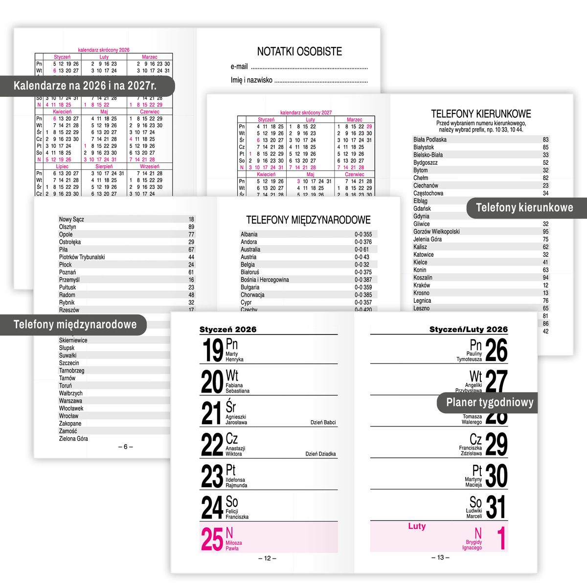 - Część informacyjna: strony na notatki, telefony kierunkowe, skorowidz alfabetyczny, daty imienin i Świąt.