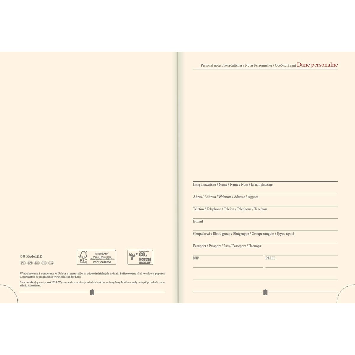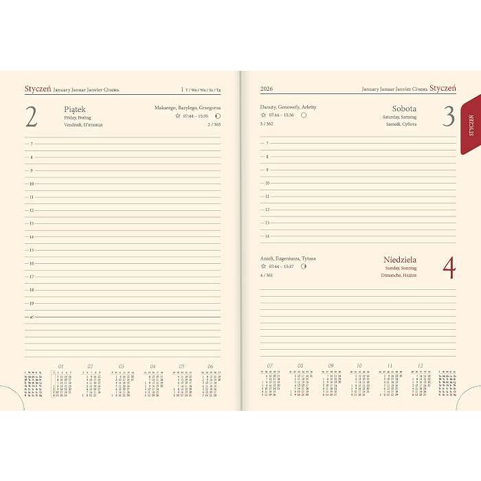 • dostępne w wielu wzorach okładki modele 21D: wymiary 14,5×20,5 cm ~A5, układ dzienny; 3 wzory