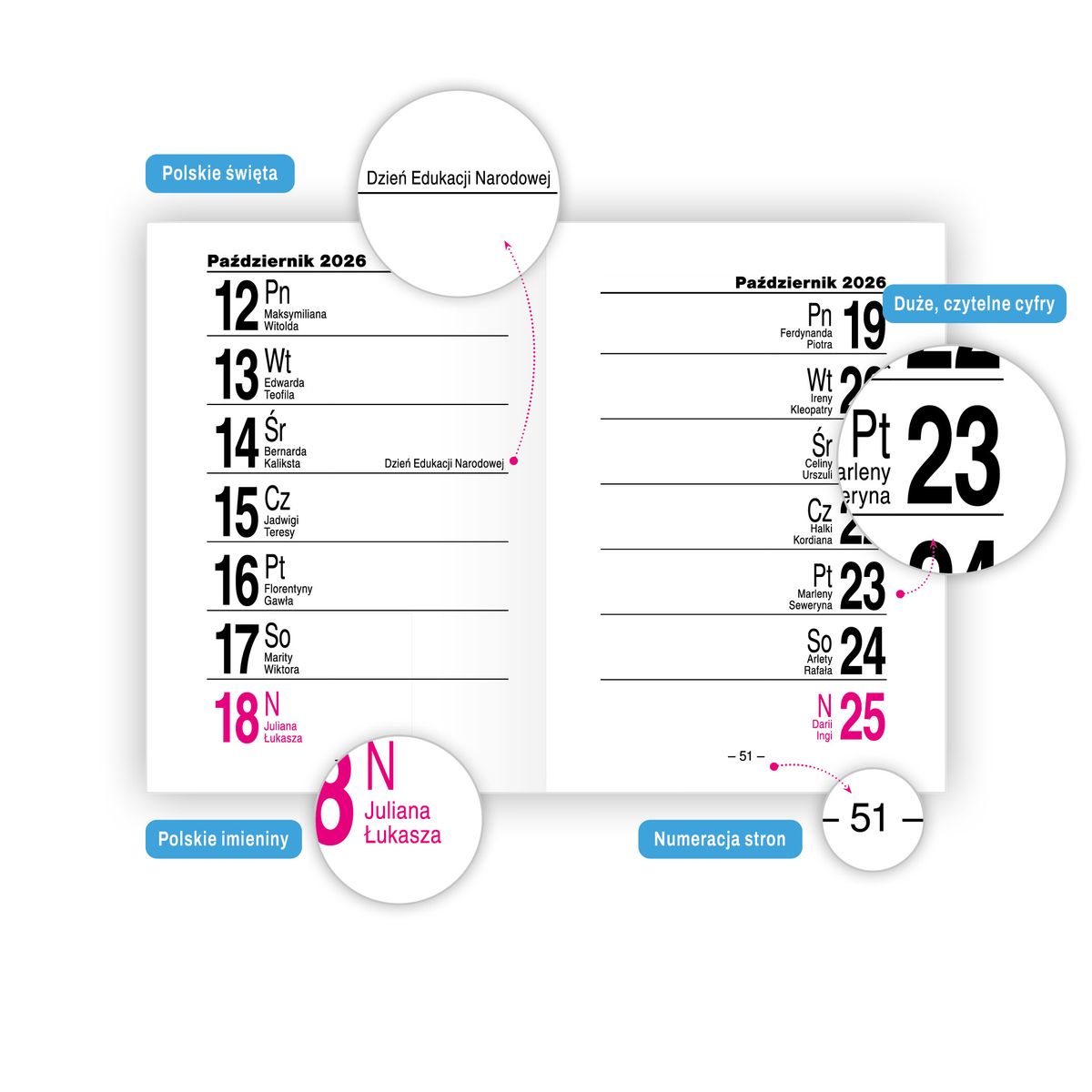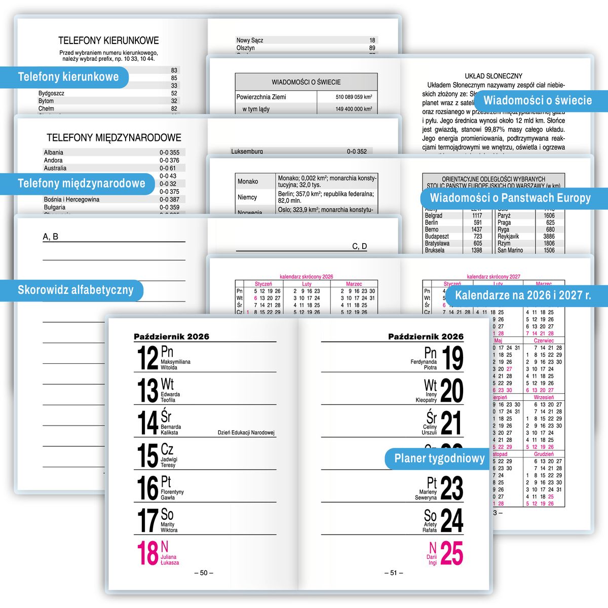 Dostępne: 280 Sztuk Lub zamów telefoniczne: 690 216 578Kalendarz Kieszonkowy A7 Tygodniowy Premium Lux to niezastąpiony drobiazg, który zmieści się nawet w najmniejszej kieszeni. Ten mały, ale niezwykle praktyczny kalendarz to esencja funkcjonalności, umożliwiając Ci organizację dnia bez względu na to, gdzie jesteś. Z łatwością zapiszesz w nim swoje najważniejsze spotkania i zadania, a jego inteligentny układ pozwoli Ci na szybki dostęp do każdej potrzebnej informacji. Kompaktowa wytrzymałość: Mimo swoich niewielkich rozmiarów, kalendarz jest wyjątkowo wytrzymały. Twarda okładka zapewnia ochronę Twoich notatek i przetrwa codzienne użytkowanie. Styl i funkcjonalność: Prosty i elegancki design sprawia, że kalendarz jest stylowym dodatkiem do każdego zestawu, podkreślając Twój profesjonalizm i zmysł organizacji. Praktyczny układ: Kalendarz zawiera 64 stron w układzie tygodniowym, co pozwala na efektywne planowanie i zarządzanie czasem. Pomimo swoich kompaktowych wymiarów, zapewnia wystarczającą przestrzeń na zapisy i organizację. Mobilność i wygoda: Dzięki niewielkim rozmiarom, możesz mieć swój kalendarz zawsze pod ręką, bez względu na okoliczności. To doskonałe rozwiązanie dla tych, którzy pragną mieć swój czas zawsze pod kontrolą, gdziekolwiek się znajdują. Wybierz Kalendarz Kieszonkowy A7 Tygodniowy Premium Lux i ciesz się idealnym połączeniem mobilności, funkcjonalności i stylu. Dostępny w 4 kolorach