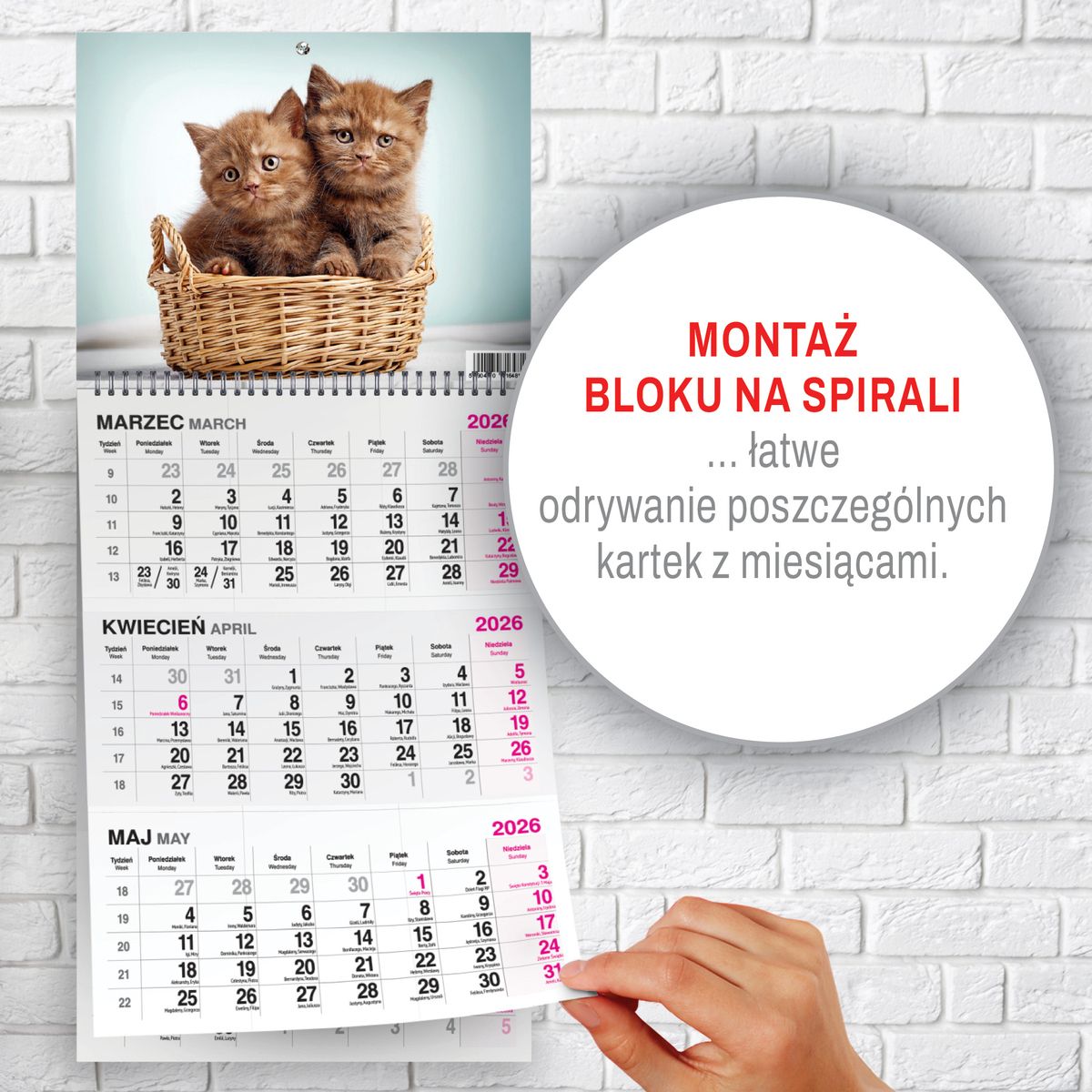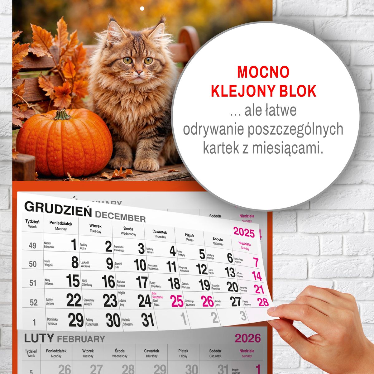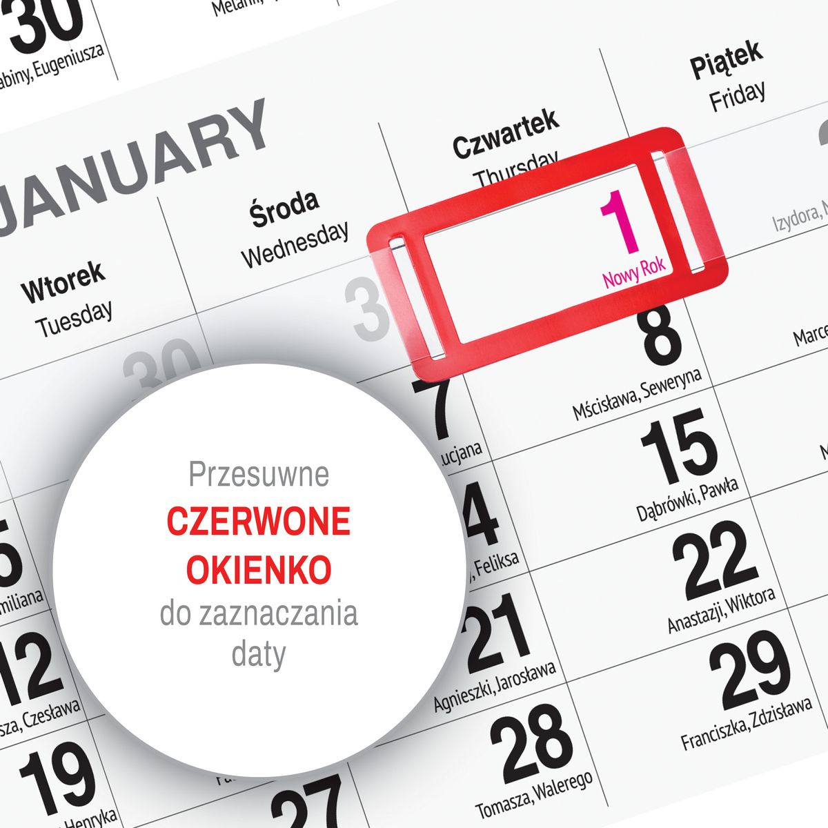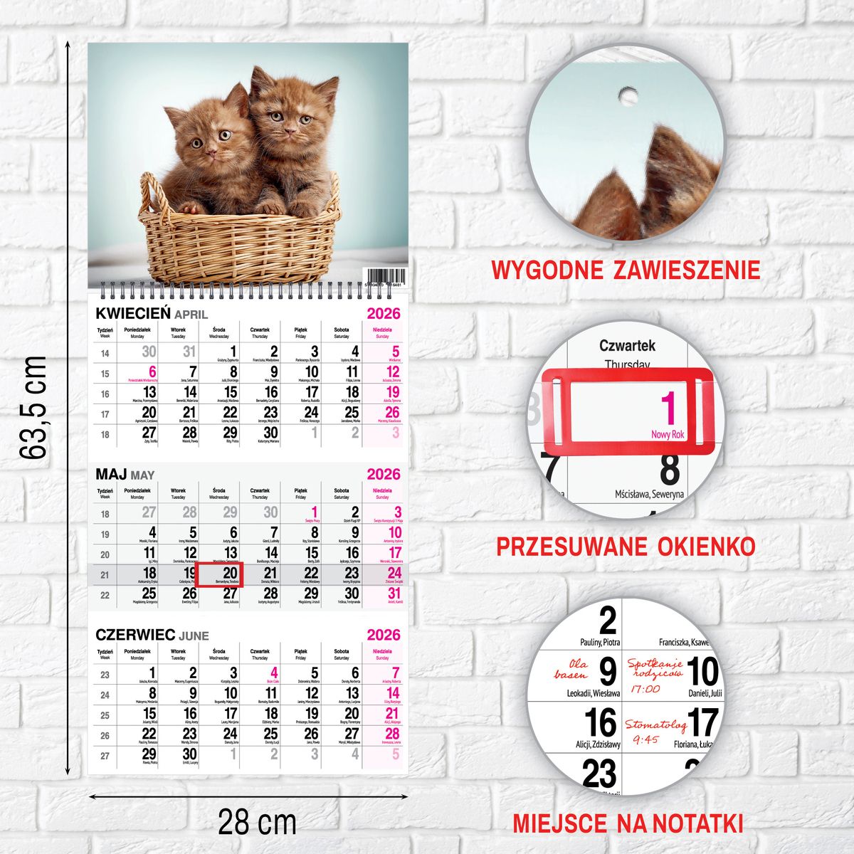 Praktyczne przesuwane okienko umożliwia intuicyjne zaznaczanie aktualnego dnia, co znacząco ułatwia codzienne użytkowanie. Dzięki temu kalendarz sprawdza się zarówno w środowisku domowym, jak i biurowym, gdzie szybki dostęp do aktualnej daty jest niezbędny.