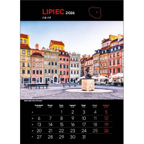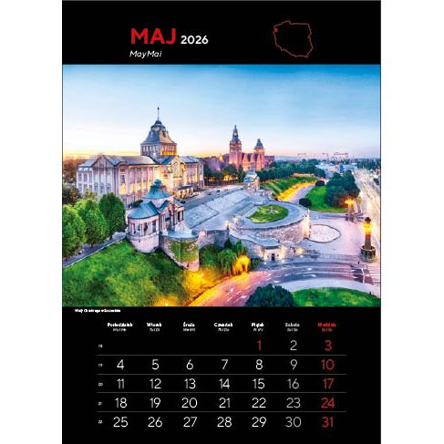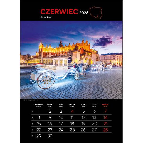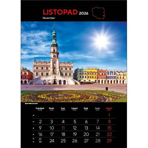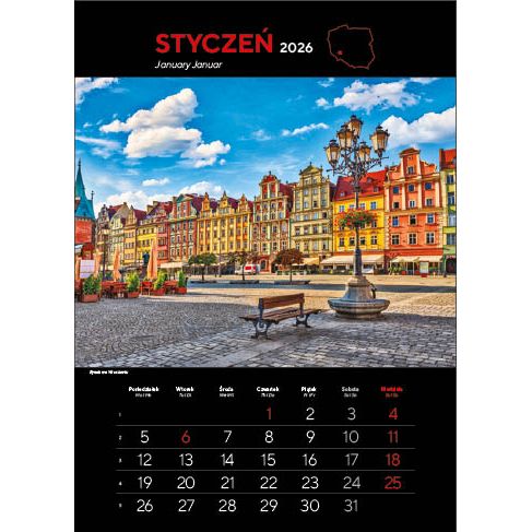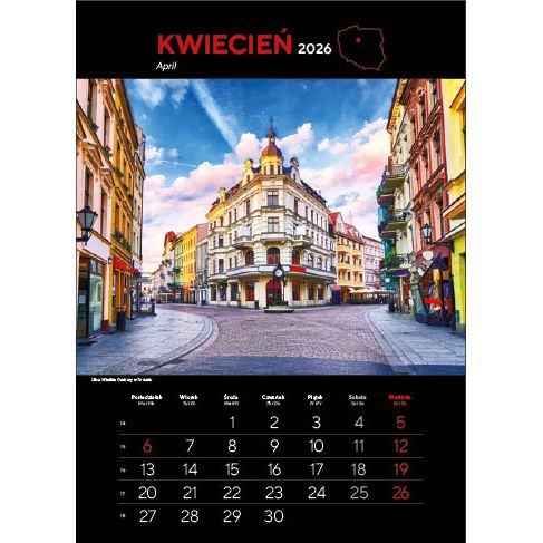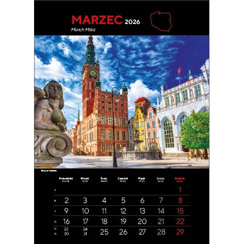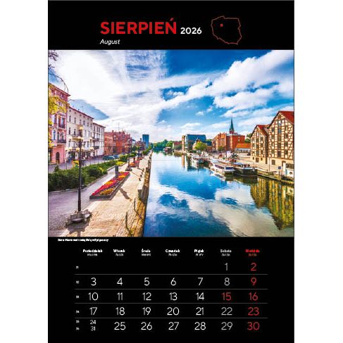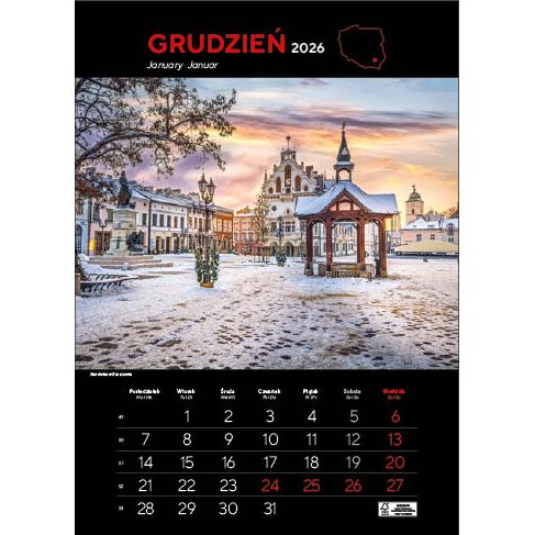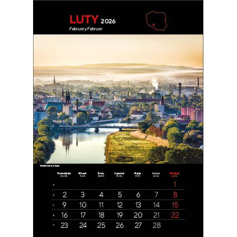 KALENDARZ: składa się z okładki, 12 kart papieru kredowego ze zdjęciami i kalendarium (trójjęzyczne z numeracją tygodni) oraz kartonowych plecków, wystających o 6 cm poza dolny brzeg kalendarza. Nadruk wykonywany jest na wystającym fragmencie plecków.