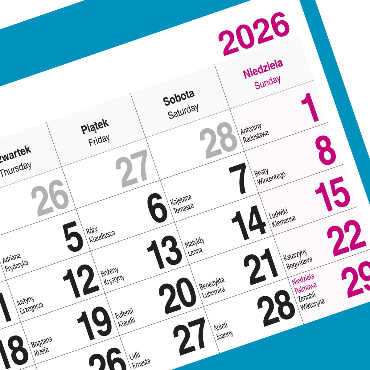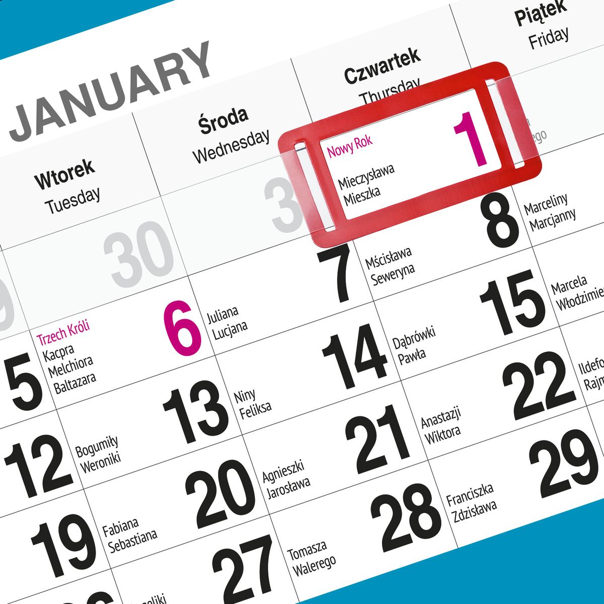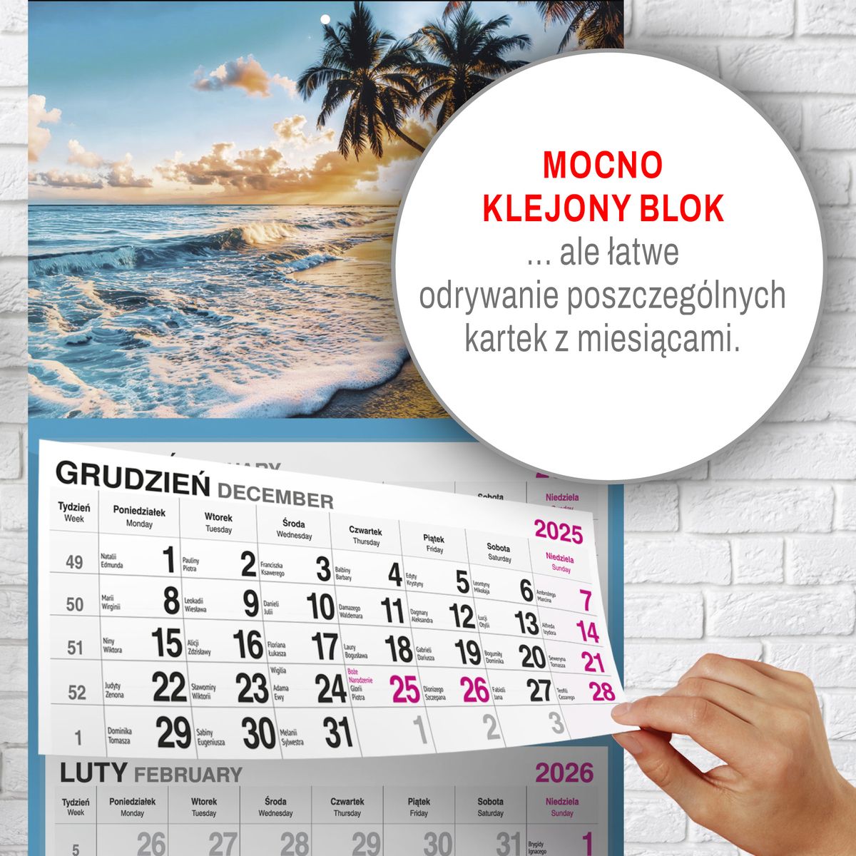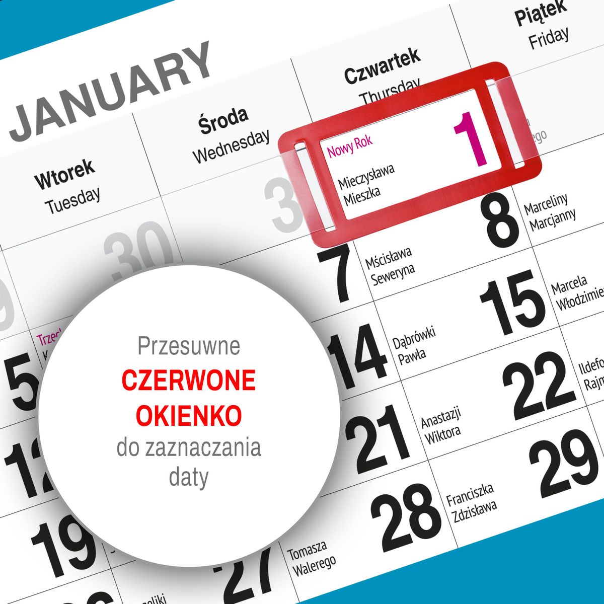 Praktyczne przesuwane okienko umożliwia intuicyjne zaznaczanie aktualnego dnia, co znacząco ułatwia codzienne użytkowanie. Dzięki temu kalendarz sprawdza się zarówno w środowisku domowym, jak i biurowym, gdzie szybki dostęp do aktualnej daty jest niezbędny.