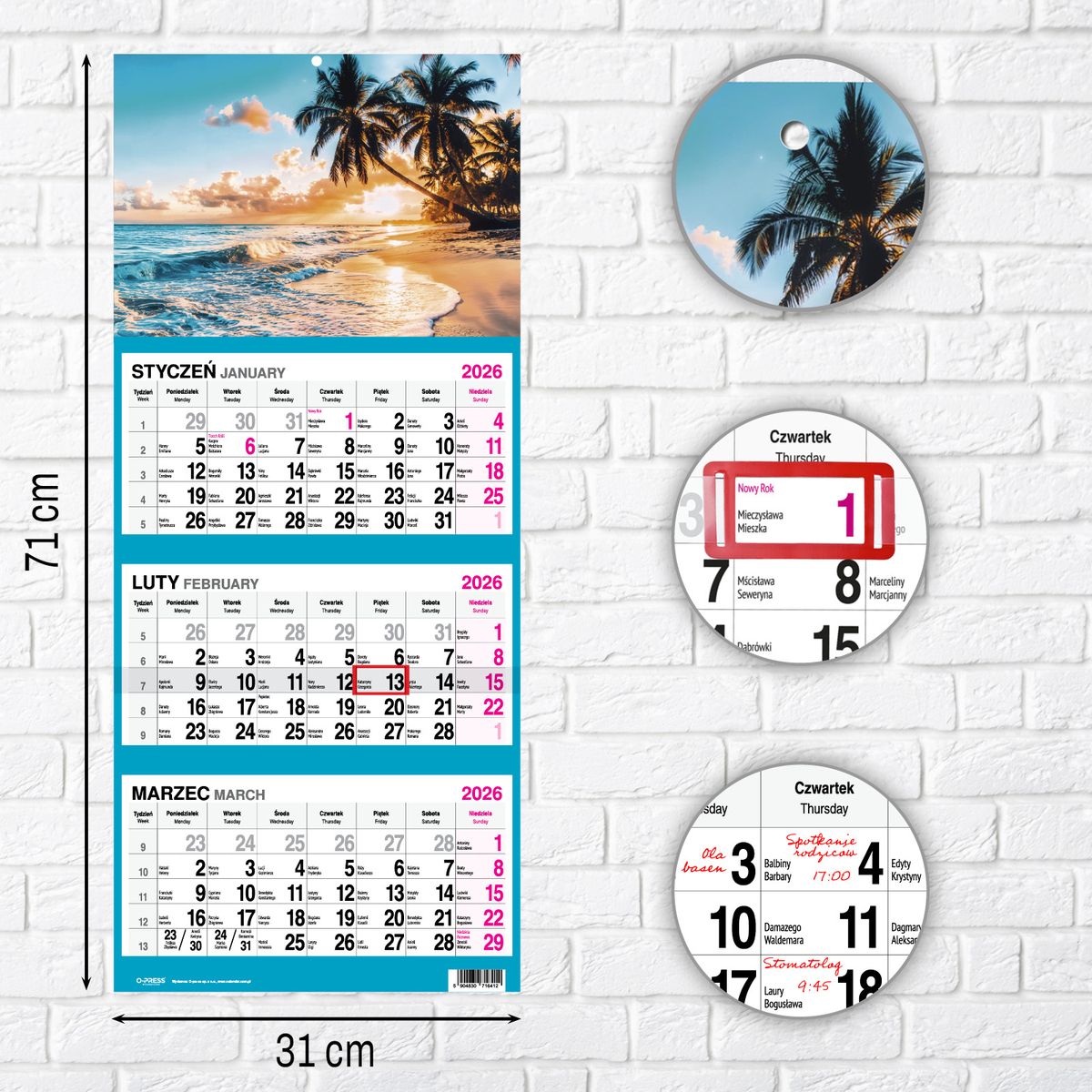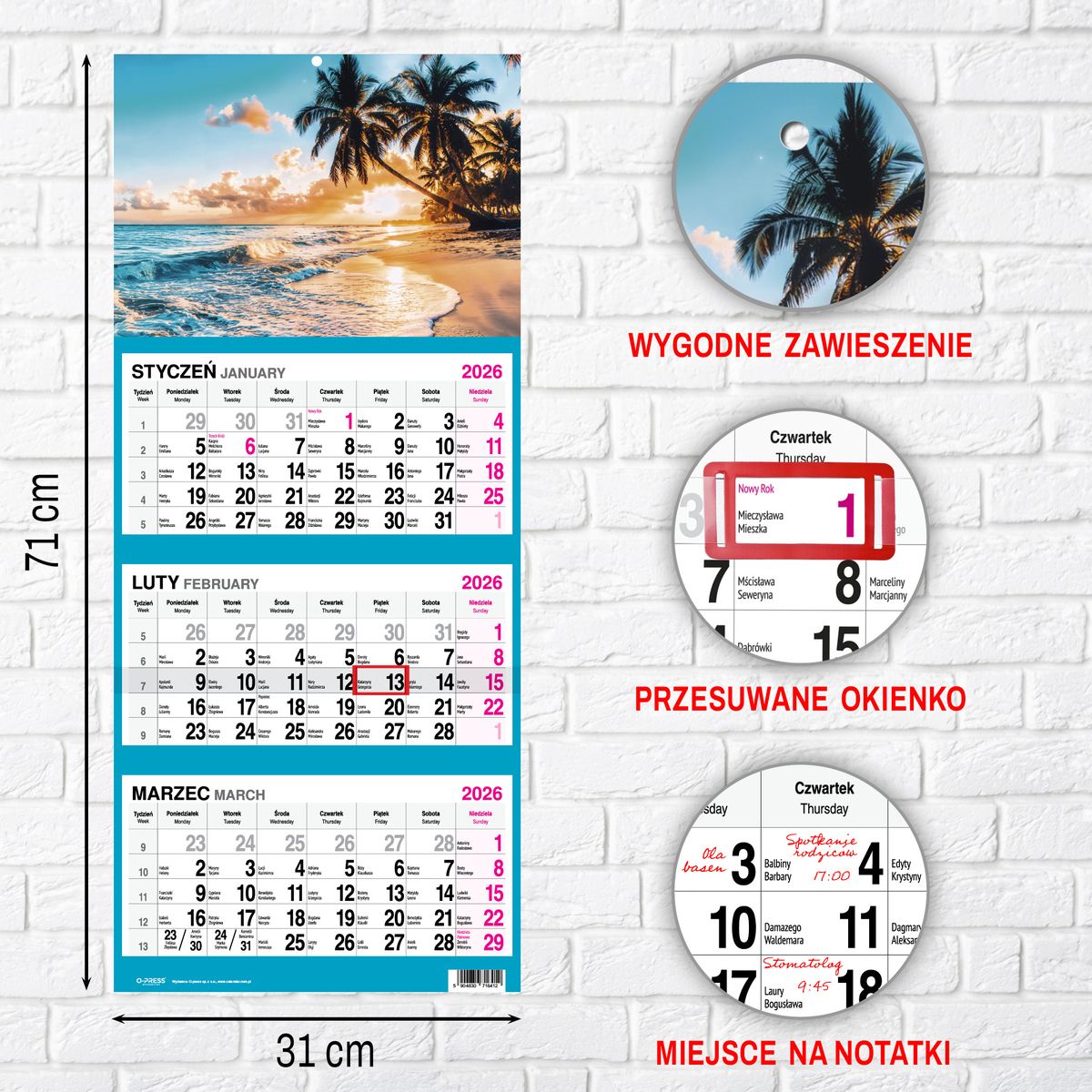 Wyposażony w wytrzymałą dziurkę, kalendarz można łatwo i bezpiecznie zawiesić na ścianie, zapewniając jego widoczność oraz dostępność w każdej chwili. Format 310x790x4 mm gwarantuje czytelność kalendarium oraz komfort użytkowania.
