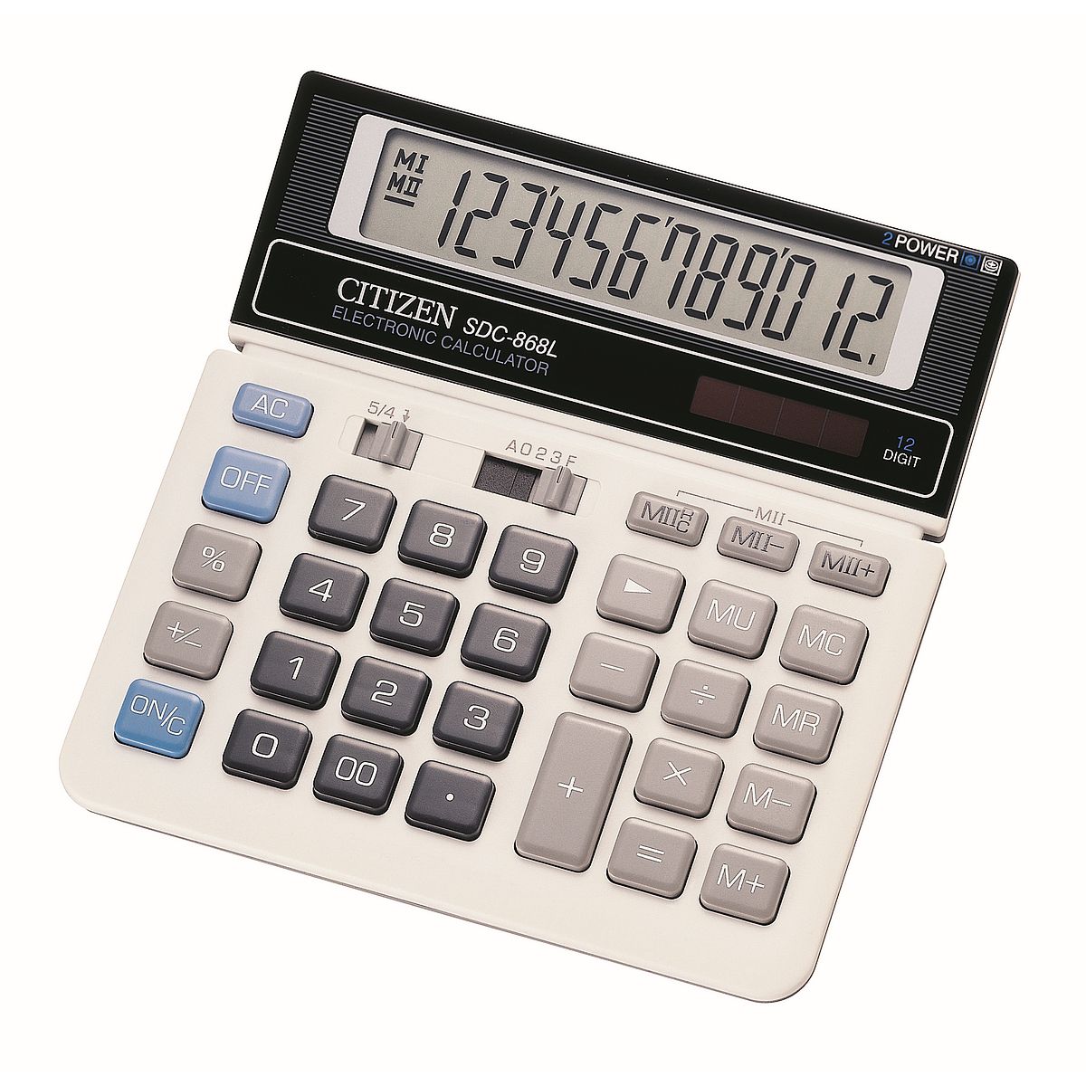 Kalkulator biurowy: 12-pozycyjny wyświetlacz, 4 przyciski pamięci: MC, MR, M+, M-, Podwójna pamięć [MII], Zmiana znaku [+/-], Procenty [%], Podwójne zero [00], Zaokrąglanie wyników, Obliczanie marży [MU], Wybór dziesiętny, Kasowanie ostatniej pozycji, Podwójne zasilanie: bateria i bateria słoneczna
