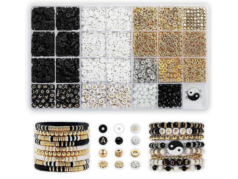 Dostępne: 7 Sztuk Lub zamów telefoniczne: 690 216 578zestaw do robienia bransoletek, koraliki czarne, białe, złote i srebrne, aplikacje, literki, sznurki; Box