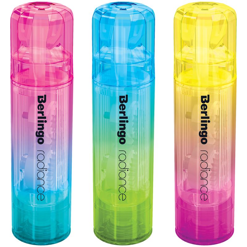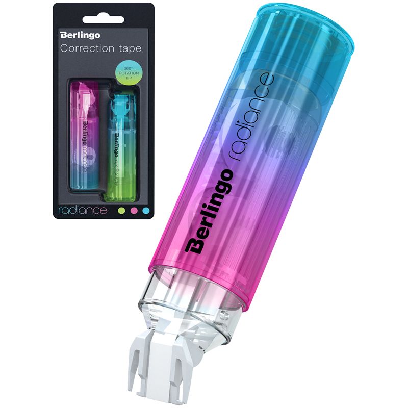 Zestaw dwóch korektorów w taśmie "Radiance". Projekt obudowy jest wykonany w jasnych kombinacjach kolorystycznych w stylu gradientu. Odpowiednie do poprawiania maszynopisu lub tekstu pisanego odręcznie. Szczelna i precyzyjna powłoka, nie wymaga czasu schnięcia. Posiada ruchomą końcówkę, dzięki czemu taśmę można stosować pod dowolnym kątem. Stabilizator pozwala uzyskać prostą linię. Pakowane po 2 szt na blistrze. Szerokość taśmy 5mm, długość taśmy 6m.
