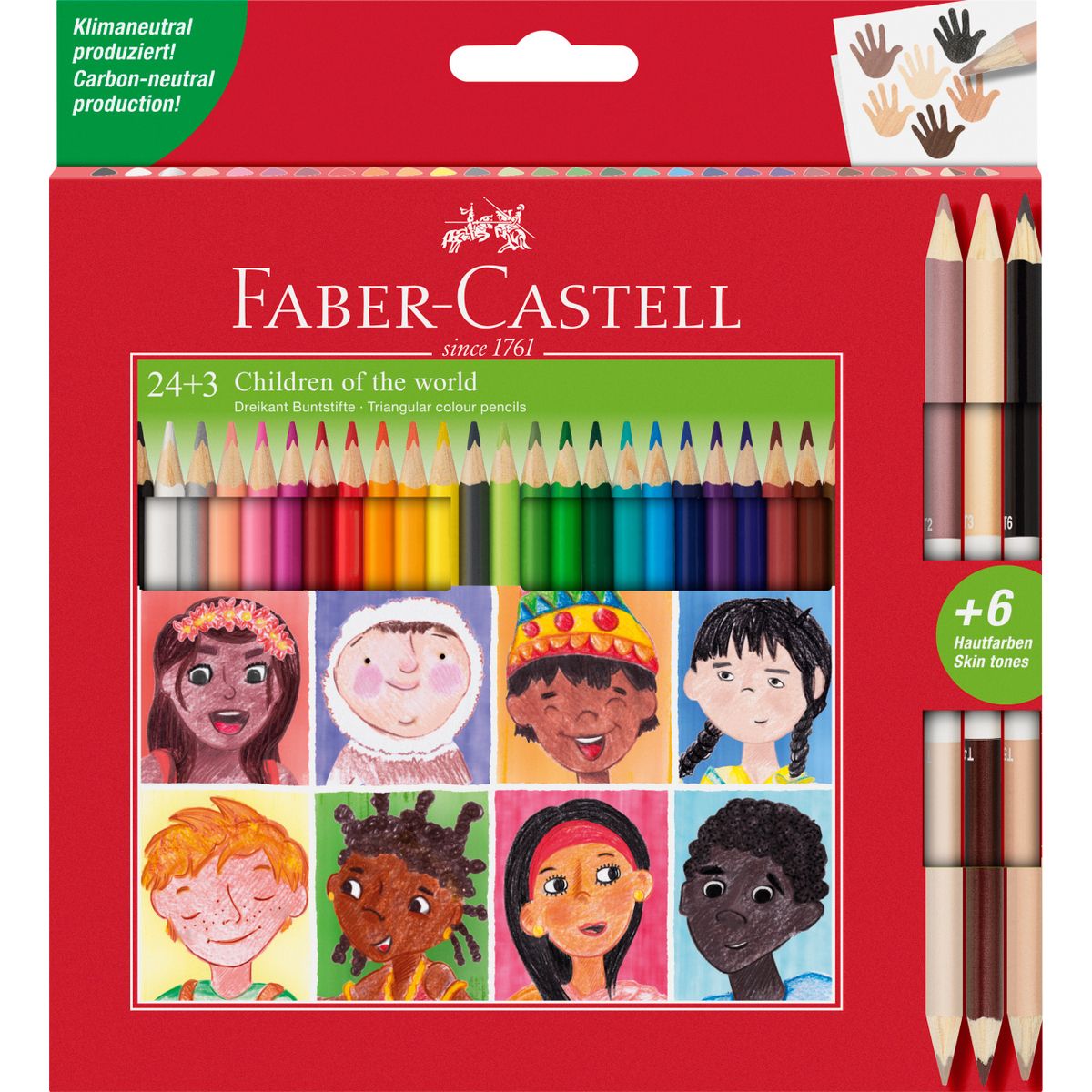 Kredki ołówkowe Faber-Castell 24 szt. w edycji specjalnej z kredkami dwustronnymi Children of the World 3 szt. (6 kolorów) w opakowaniu kartonowym. Klasyczne i doskonałe w swojej prostocie. To wysokiej jakości produkt, w dobrej cenie. Wyraźne i nasycone kolory, specjalnie dobrane przez nauczycieli, optymalnie miękkie i gładkie w aplikacji. Spieralne z większości tkanin. Ergonomiczny trójkątny kształt dla wysokiego komfortu użytkowania i możliwości wygodnej, niestrudzonej artystycznej ekspresji. Grafit kredek jest wysoko odporny na pękanie, dzięki bezpiecznemu procesowi wiązania (SV). Wykonane z certyfikowanego drewna pochodzącego ze zrównoważonego i odpowiedzialnie zarządzanego leśnictwa.