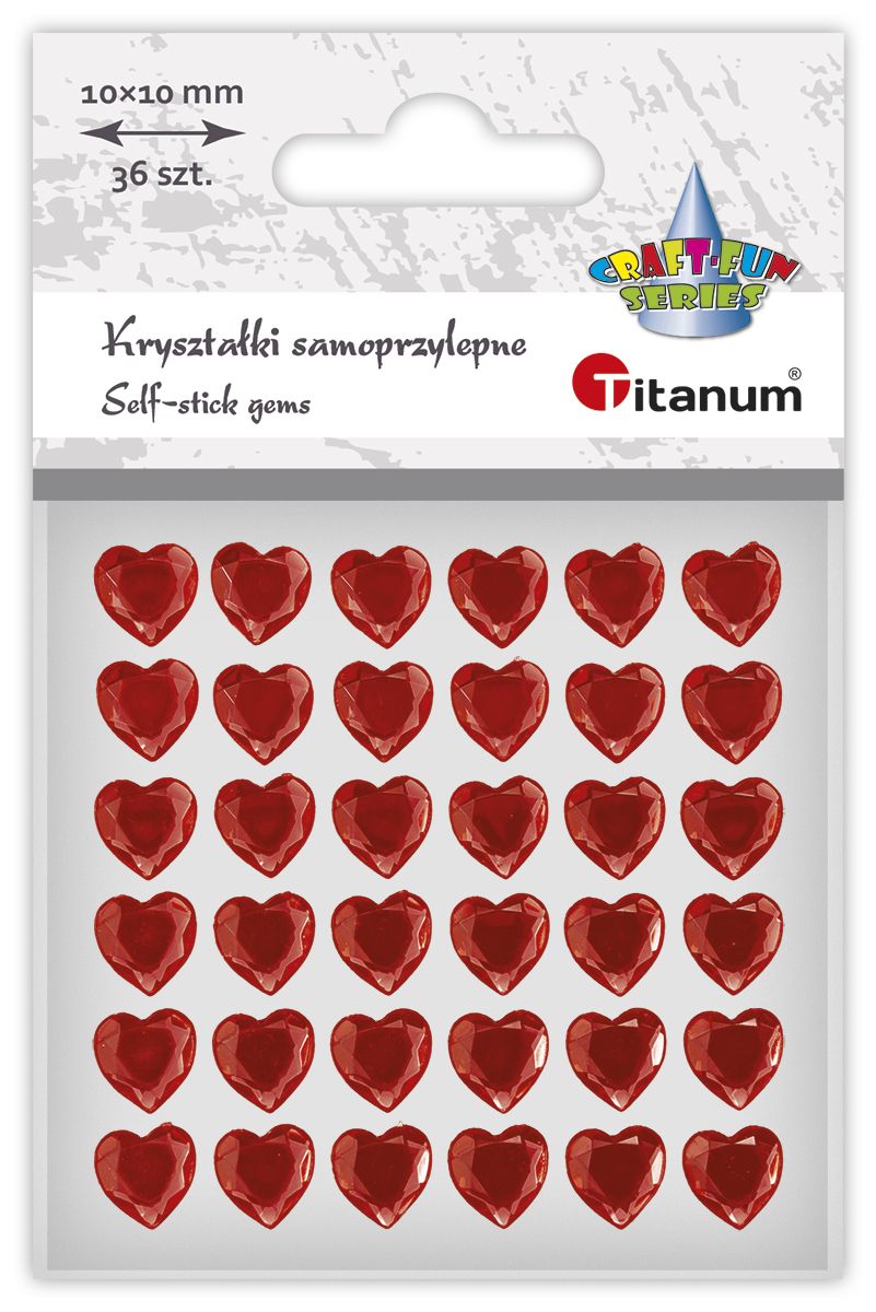 Dostępne: 2914 Sztuk Lub zamów telefoniczne: 690 216 578Kryształki samoprzylepne, wzór: serca, wymiary: 10 x 10 mm, kolor: czerwone. 36 sztuk.
