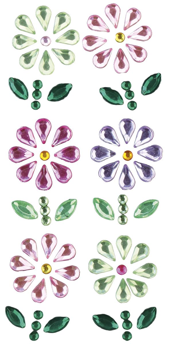 Dostępne: 1081 Sztuk Lub zamów telefoniczne: 690 216 578Kryształki samoprzylepne, wzór: kwiaty, wymiary: 13 x 21 mm, mix kolorów. 8 sztuk.