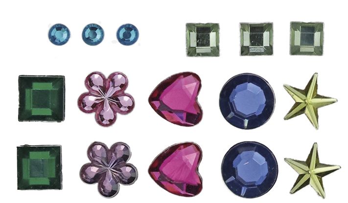 Dostępne: 805 Sztuk Lub zamów telefoniczne: 690 216 578Kryształki samoprzylepne, wzór: kółka, kwadraty, kwiatki, serca, gwiazdki, mix kolorów. 80 sztuk.