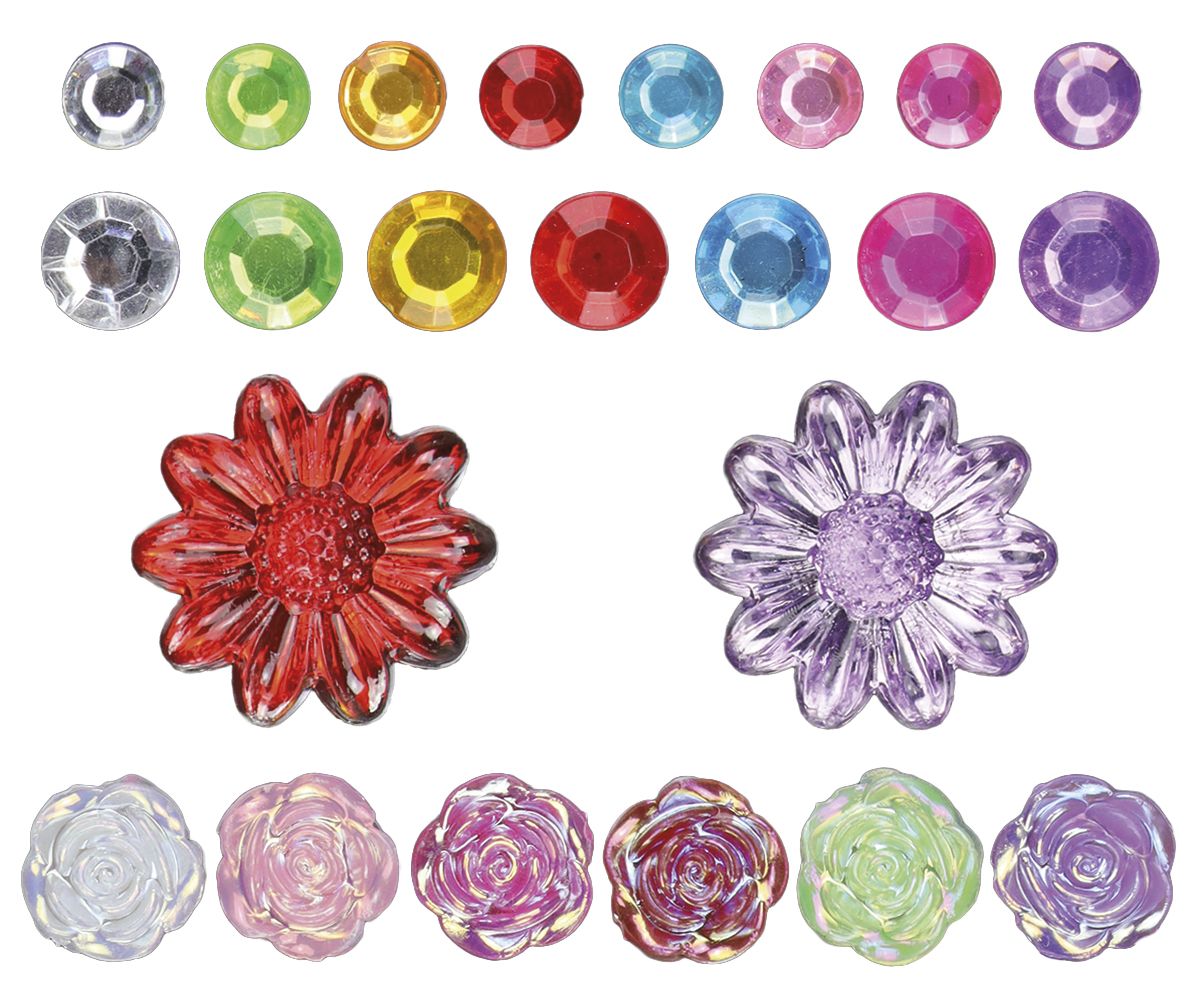 Dostępne: 1662 Sztuk Lub zamów telefoniczne: 690 216 578Kryształki samoprzylepne, mix wzorów: kwiaty - średnica 10mm/20mm, okrągłe - średnica 6mm/8mm, mix kolorów. 90 sztuk.