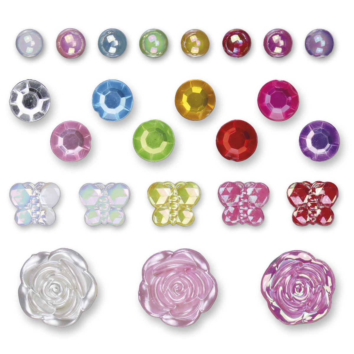Dostępne: 1537 Sztuk Lub zamów telefoniczne: 690 216 578Kryształki samoprzylepne, mix wzorów, kwiaty - średnica 15 mm, motyle -10 x 10 mm, okrągłe - średnica 8 mm, perełki okrągłe - średnica 5mm/6mm, mix kolorów. 99 sztuk.