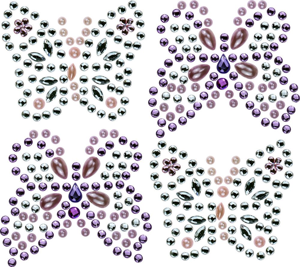 Dostępne: 887 Sztuk Lub zamów telefoniczne: 690 216 578Kryształki samoprzylepne, wzór: motyle 42x30/45x36/47x40 mm, tonacja różowo-fioletowa. 10 sztuk.