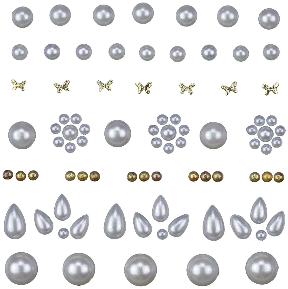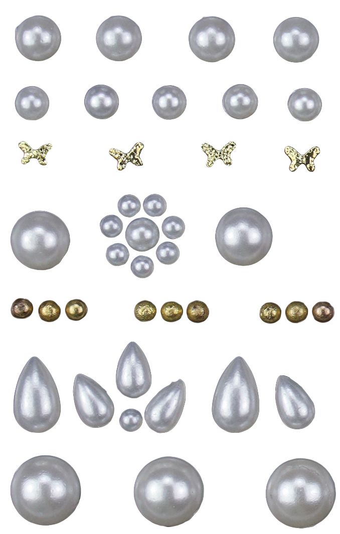 Dostępne: 1073 Sztuk Lub zamów telefoniczne: 690 216 578Perełki samoprzylepne mix wzorów: okrągłe 3/4/5/6 mm, łezki 4x6 mm, motylki 3x2 mm, dekor kwiat 7 mm, dekor 3 złote perełki 6x2 mm, dekor z łezek 10x8 mm.