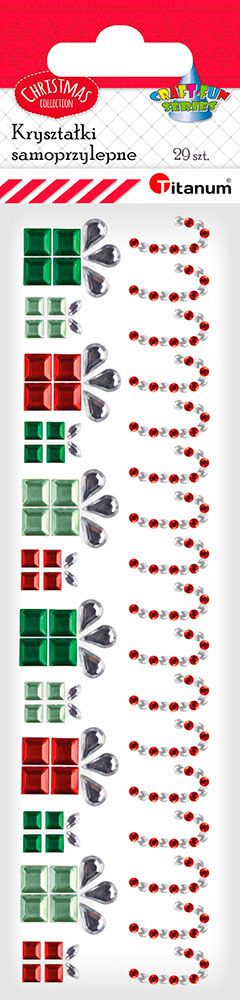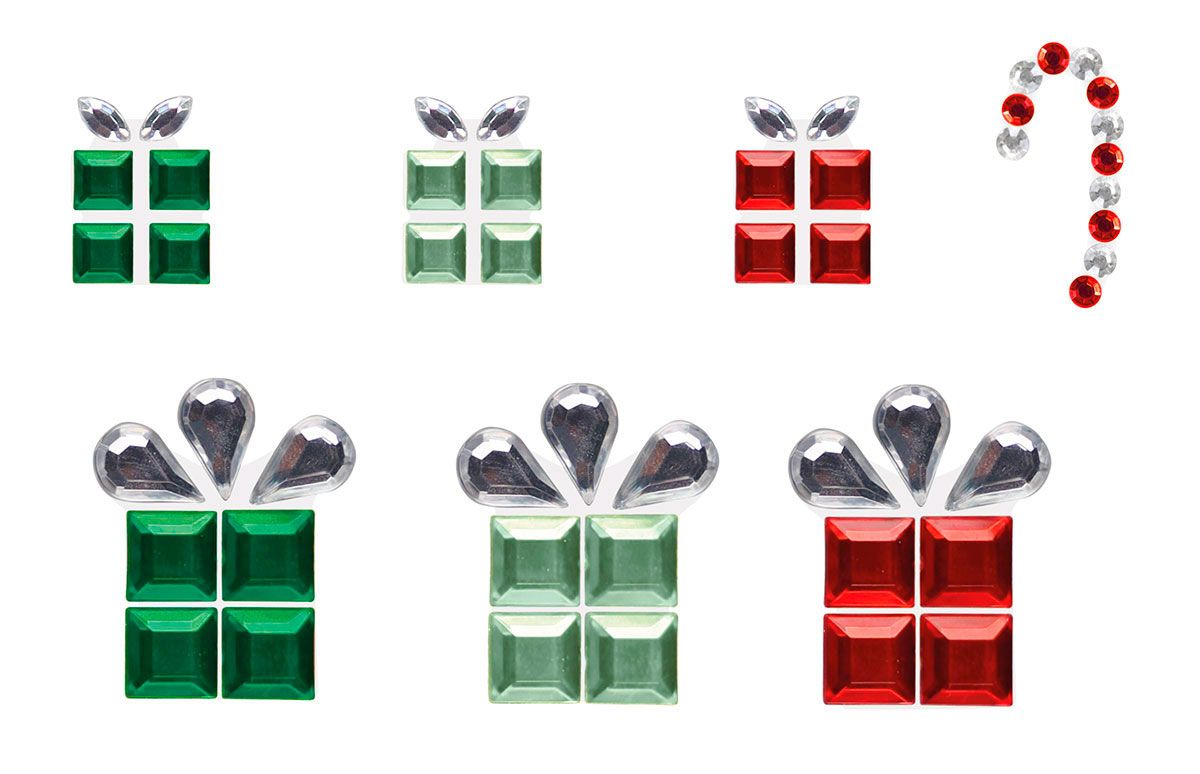 Dostępne: 719 Sztuk Lub zamów telefoniczne: 690 216 578Kryształki samoprzylepne, wzory: prezenty 9x13/17x21 mm, laska cukrowa 8x17 mm. 29 sztuk.