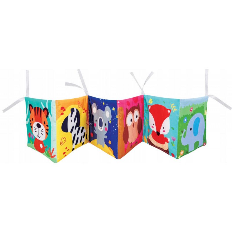 Materiałowa książeczka zabawi najmłodszych kolorowymi obrazkami. Z jednej strony harmonijki znajdują się urocze zwierzątka, a z drugiej, pojazdy. Poszczególne strony książeczki wykonane zostały z szeleszczącego materiału, dzięki czemu stymuluje ona zmysł dotyku i słuchu najmłodszych. Książeczka wyposażona została w praktyczne troczki, które pozwalają na przywiązanie jej do dziecięcego łóżeczka. Produkt przeznaczony jest dla dzieci od 6 miesiąca życia.