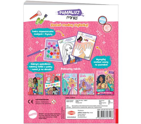 Moc kreatywnej zabawy dla małych fanek mody i makijażu! Książka zawiera gotową do użycia paletę barw. Wystarczy zamoczyć pędzelek w wodzie, wybrać odpowiednią farbkę i już można malować! Obrazki ulubionych postaci można kolorować także kredkami. Makijaże, fryzury, paznokcie, biżuteria? Każdy element wizerunku potrzebuje sprawnej ręki małej stylistki, żeby Barbie i jej przyjaciółki wyglądały zjawiskowo.