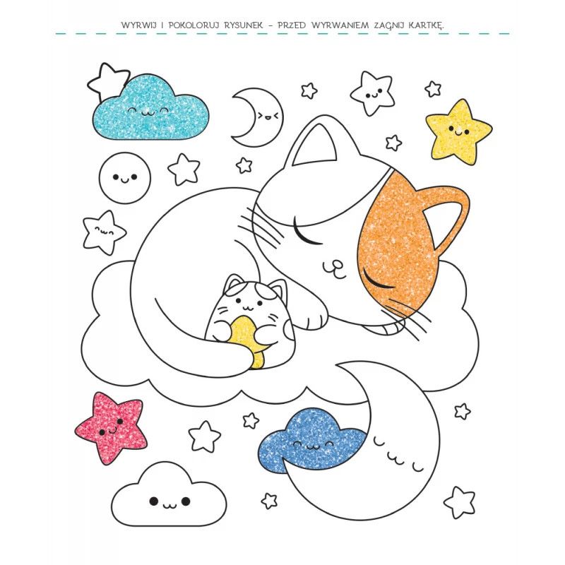 Kolorowanie uczy cierpliwości i staranności, rozwija wyobraźnię i uwrażliwia na barwy. Kolorując – dziecko ćwiczy koncentrację i rozwija zdolności manualne – przygotowuje rękę do późniejszej nauki pisania. Brokatowa kolorowanka to propozycja dla małych artystów. Na każdej stronie znajduje się rysunek pięknego kotka lub pieska z pokolorowanymi na brokatowo kilkoma elementami – dzięki czemu rysunek wygląda niezwykle elegancko. Dziecko kończy kolorowanie, używając kredek, pisaków zwykłych lub brokatowych, wedle własnych upodobań. Perforacja ułatwia wyrywanie rysunków z książki. Zamieszczone w książce obrazki spodobają się wielbicielom piesków i kotków – obrazki są staranne, ale i zabawne, wzbogacone o dodające uroku drobne elementy. Ciekawa tematyka i odpowiednie dla dzieci rysunki oraz błyszczący brokat zachęcają do pracy z tą książeczką. Pokolorowany obrazek, oprawiony w ramkę lub nie, to doskonały pomysł na ozdobienie pokoju dziecka lub prezent dla najbliższych. Zapraszamy do świata kolorów!